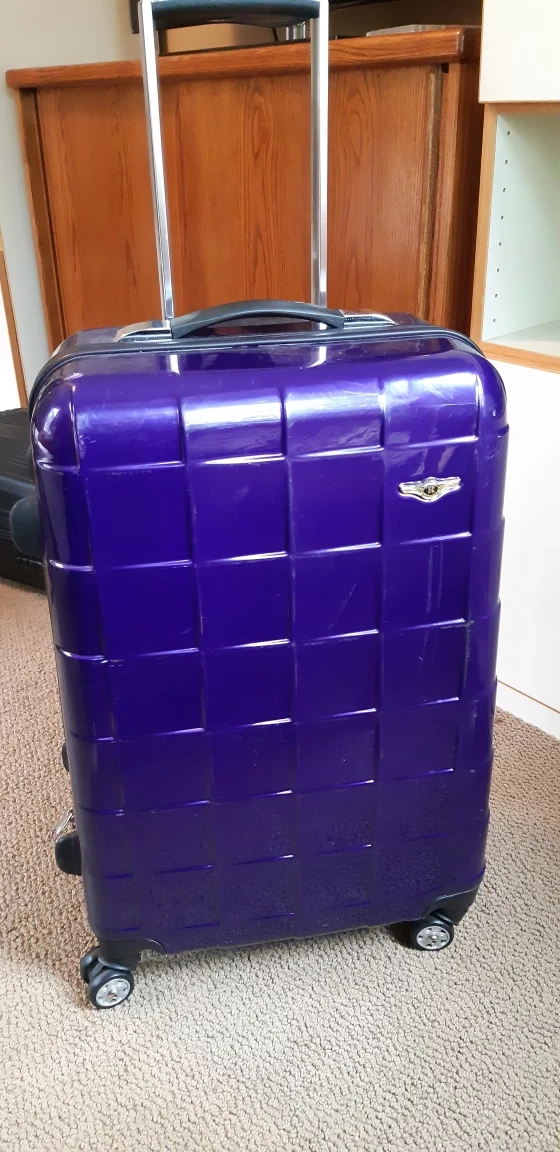 Rockland hardside carry-on suitcase...very lightweight! It's in good condition and ready for your next trip! The interior has a patterned lining and straps to keep your belongings secure. It also features a retractable handle and four wheels for easy maneuvering. Dimensions: 24" x 16" (excluding wheels)