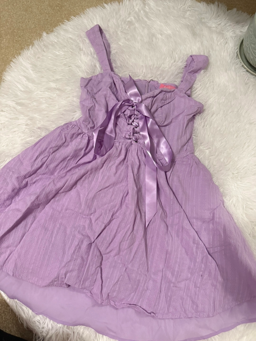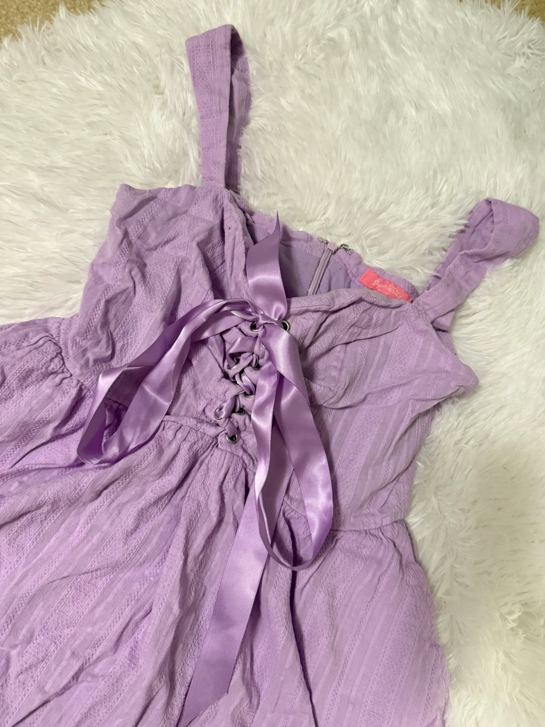 Selling a cute mini dress in a lovely shade of purple! It features a corset-style ribbon tie at the front, adding a touch of charm to the design. Perfect for a fun day out or a casual evening event