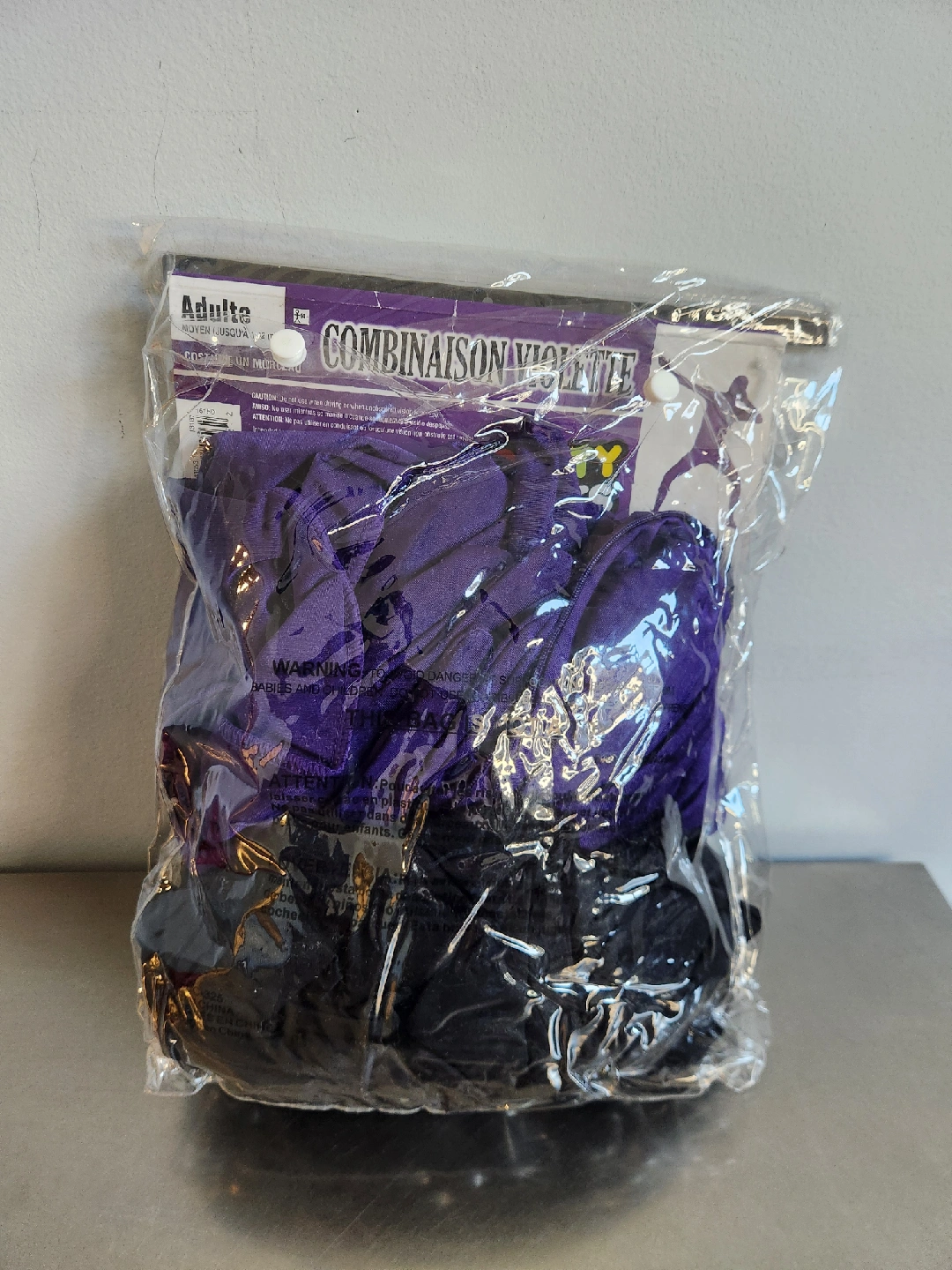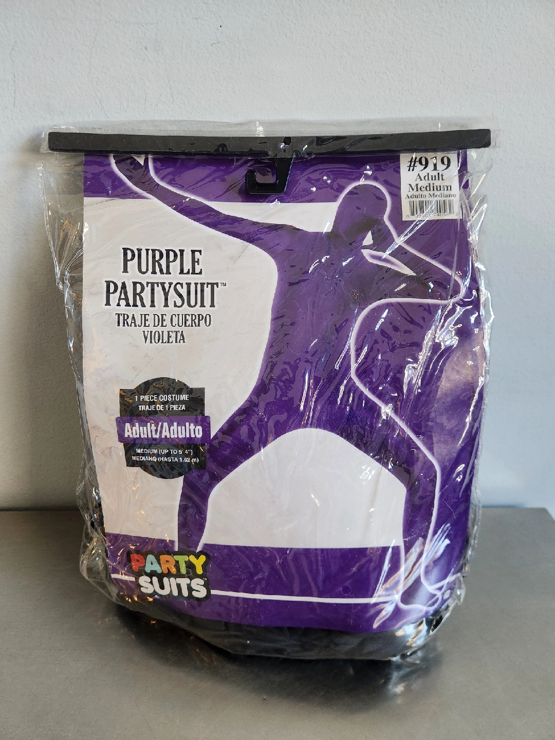 Get ready to party in this purple partysuit costume! It's an adult size medium and comes in its original packaging. Perfect for Halloween or any costume party!