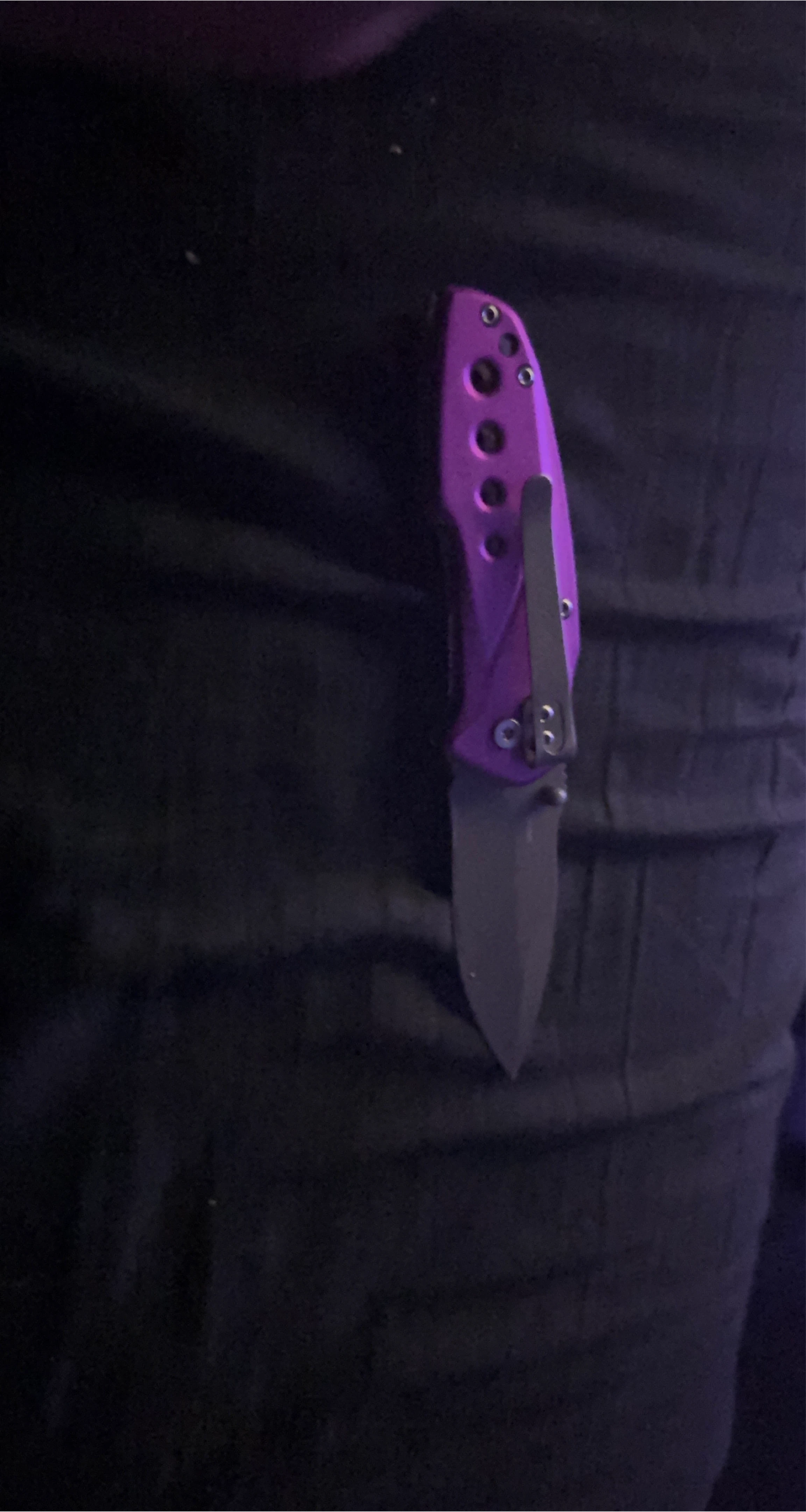Selling a purple folding pocket knife. It has a black blade and a clip on the side. Looking for cash only
