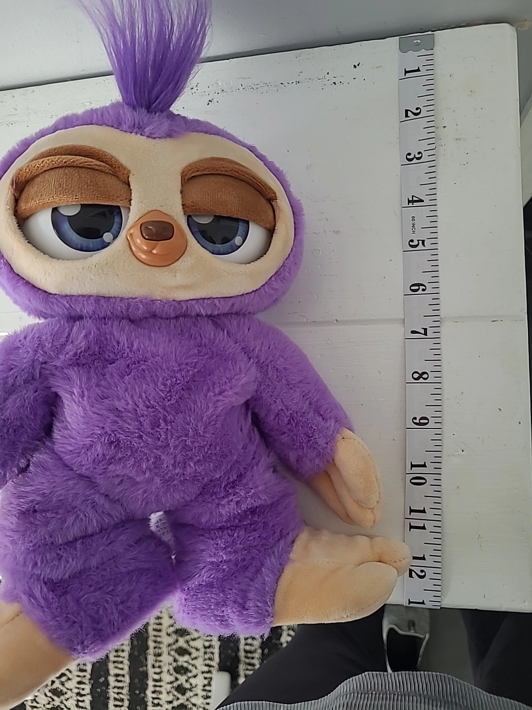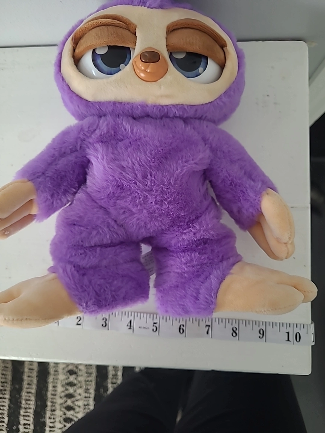 Selling a cute purple sloth plush toy! It measures about 12 inches tall and is made of polyester fibres. It's in great condition and ready for a new home dances works