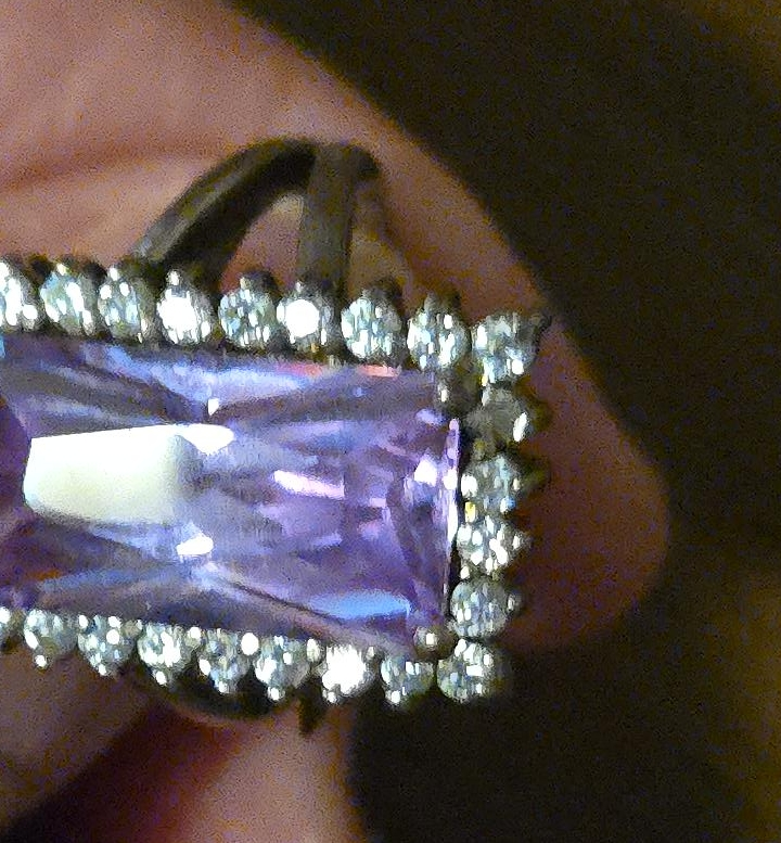 A ring with a large purple stone surrounded by smaller clear crystal stones. It's in great condition and ready for a new home! approx a size 7/8