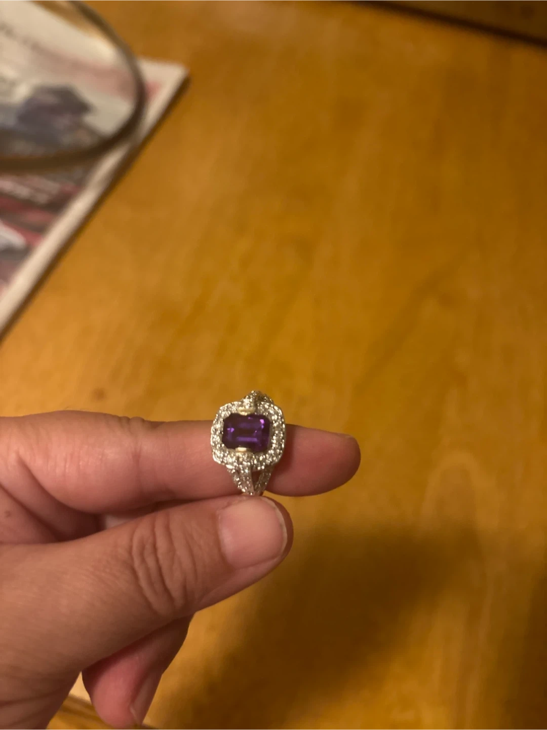 Selling a lovely ring with a purple stone. It's in great shape and ready for a new home! The ring features a unique design with a central purple stone surrounded by smaller stones. It's a beautiful piece that would make a wonderful addition to any jewellery collection