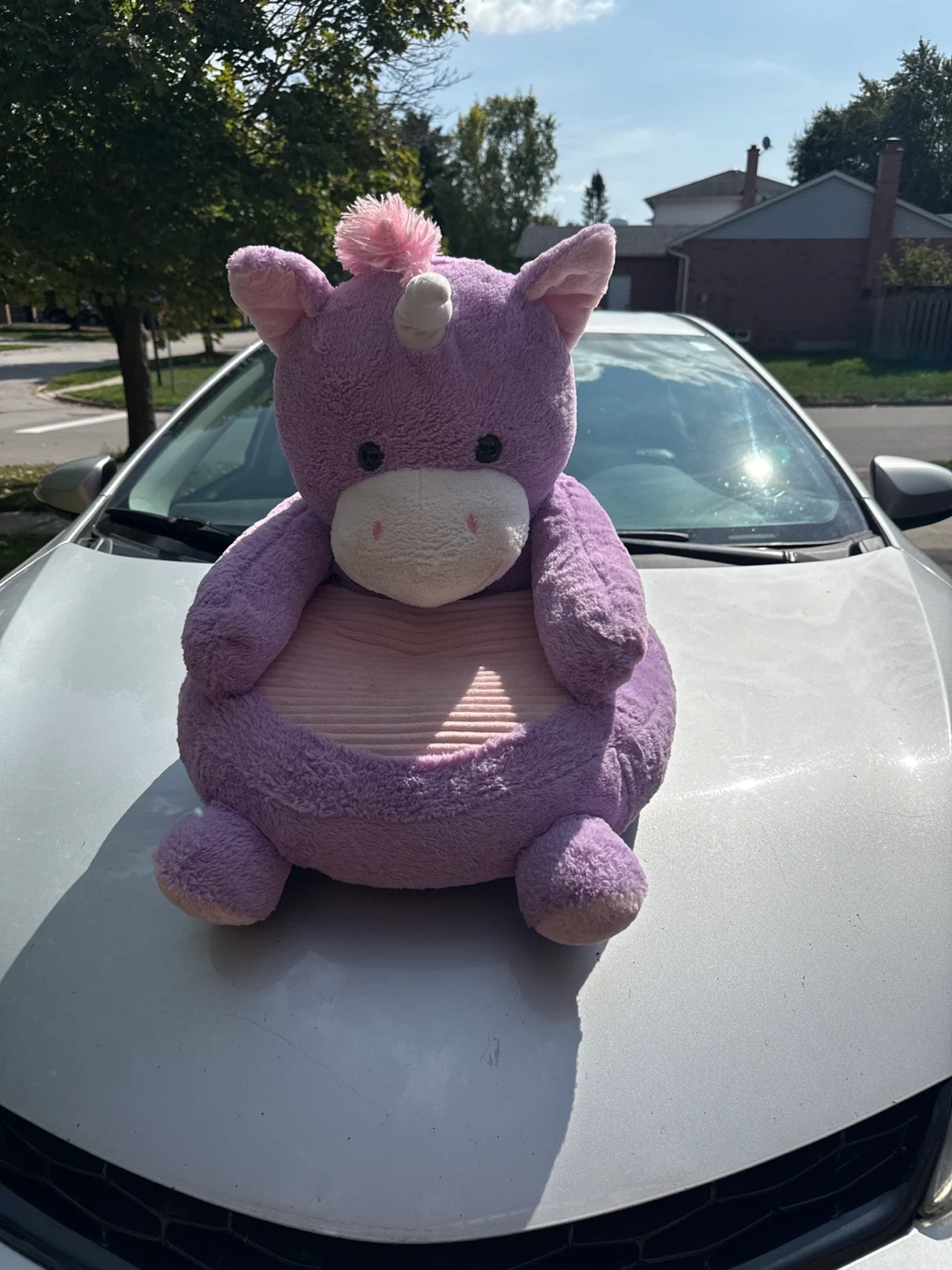 This is a cute purple unicorn plush chair! It's in great condition and would be perfect for a child's room or playroom