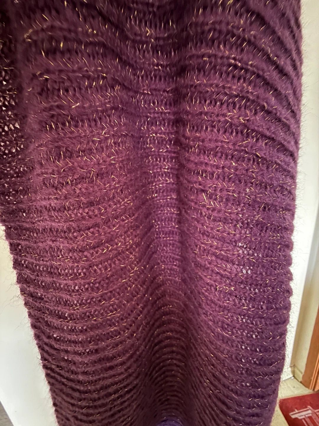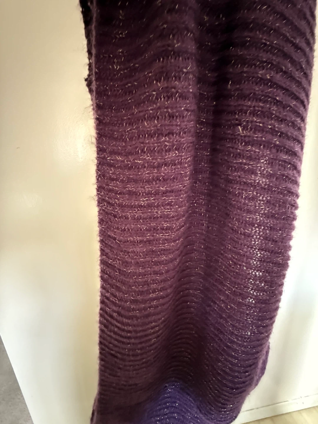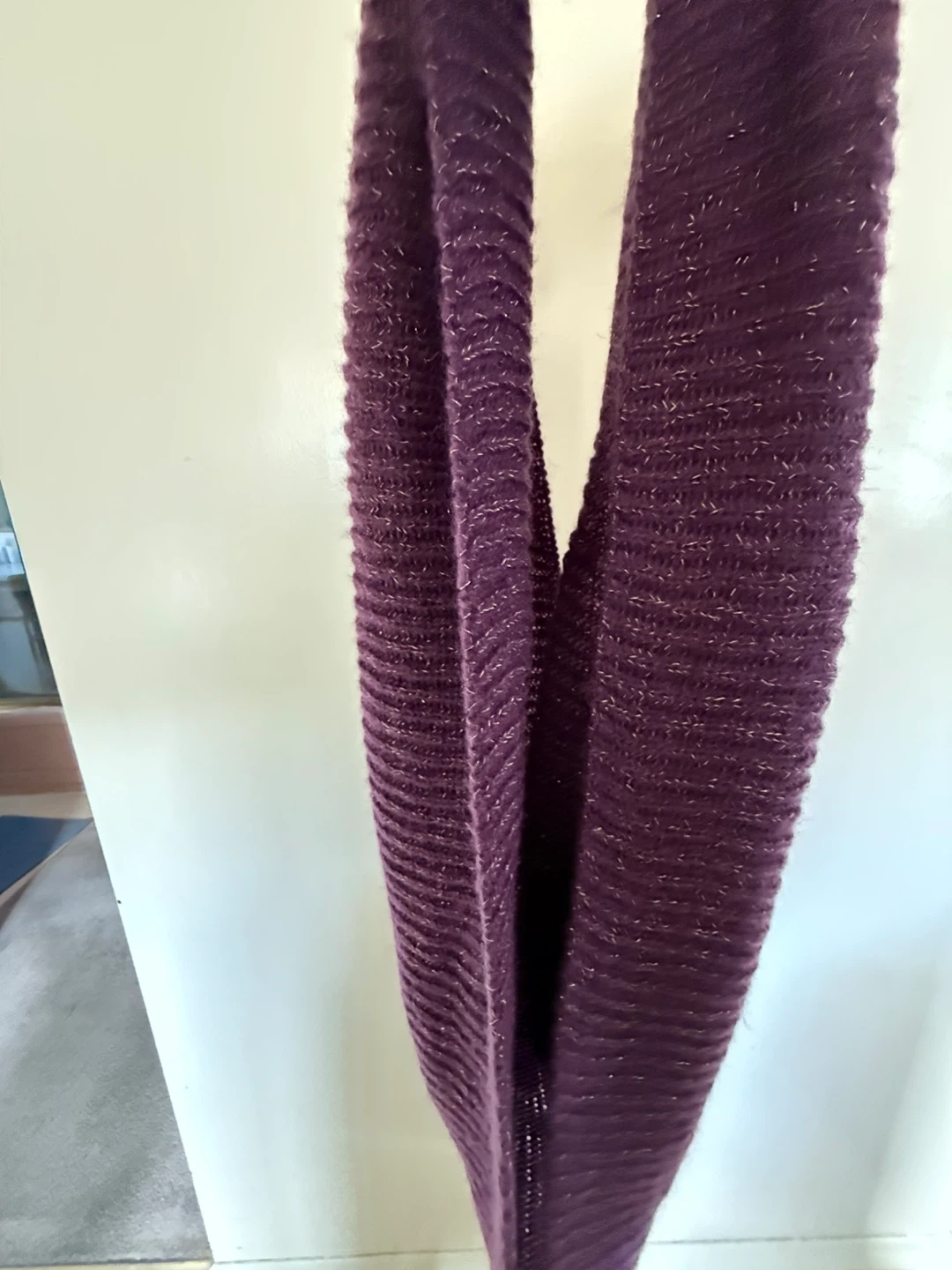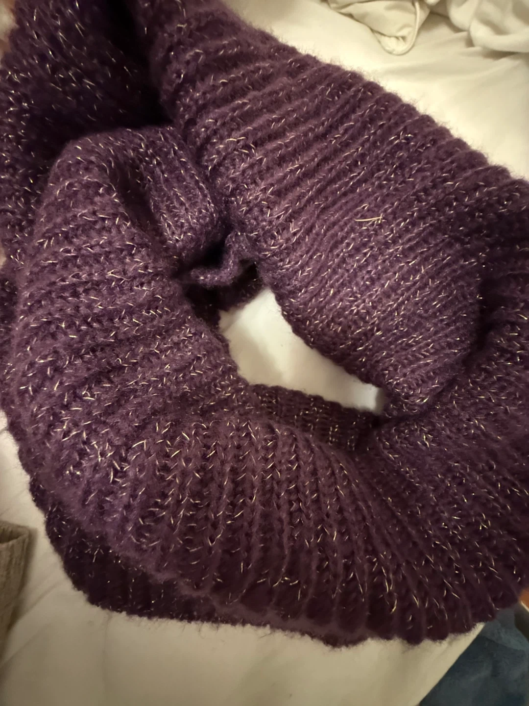 Selling a cozy purple infinity scarf! It's in great condition and would be a perfect addition to your winter wardrobe. The knit texture is really nice, and it has a subtle shimmer throughout