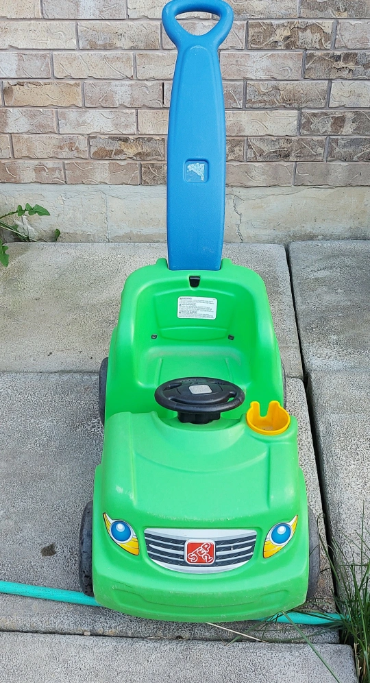 Push Around Buggy Toy Stylish and fun design eases the transition from strollers. Molded-in cup holder on buggy makes it convenient for your little one to stay hydrated. Push handle makes steering the buggy a breeze. Pretend steering wheel with a horn button. Easy to install the steering wheel. Maximum weight on ride-on: 50 lbs (22.7 kg).