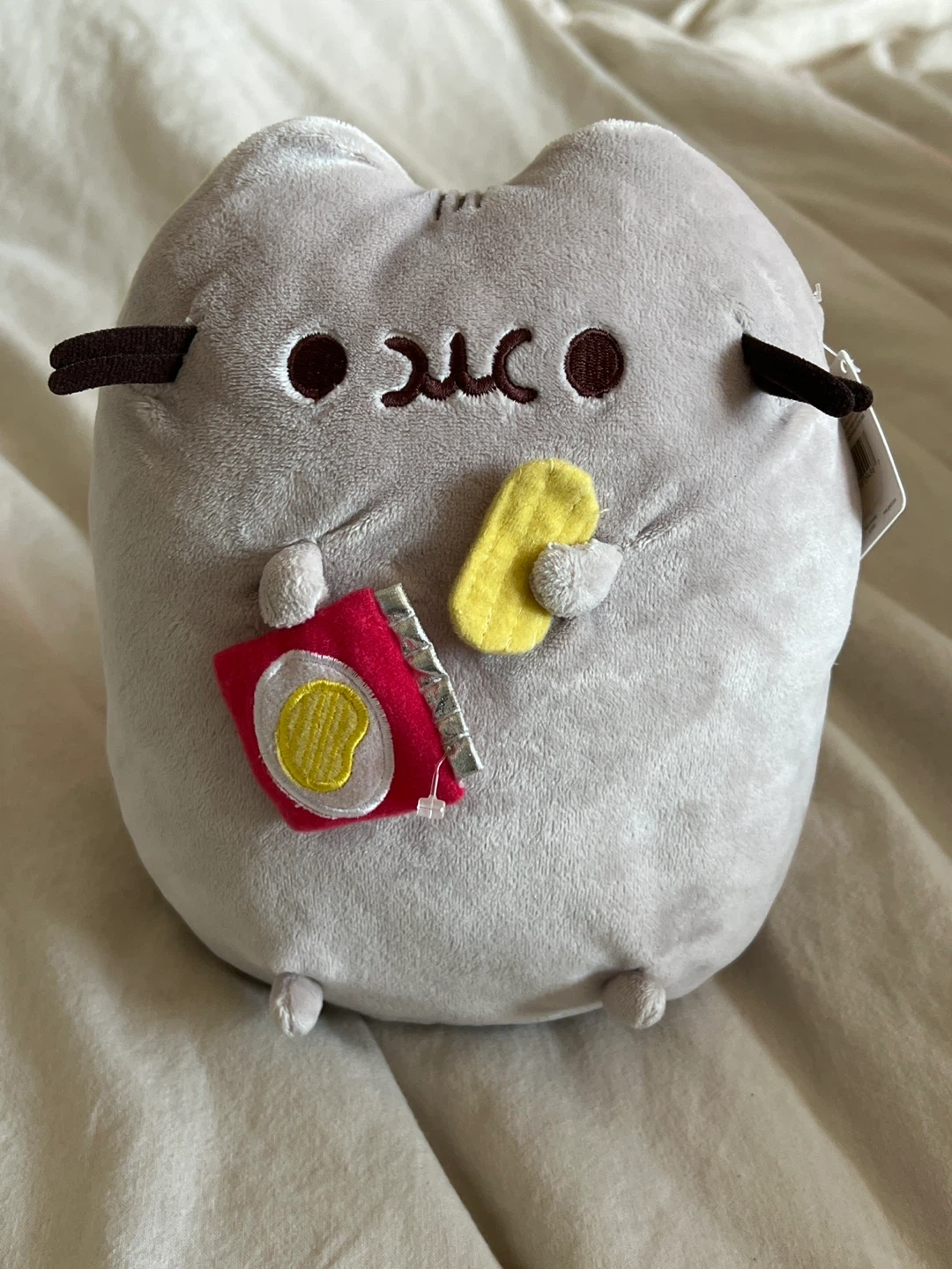 Selling a Pusheen plushie holding a bag of chips! It's in great condition and ready for a new home. This plushie is super soft and cuddly, perfect for any Pusheen fan