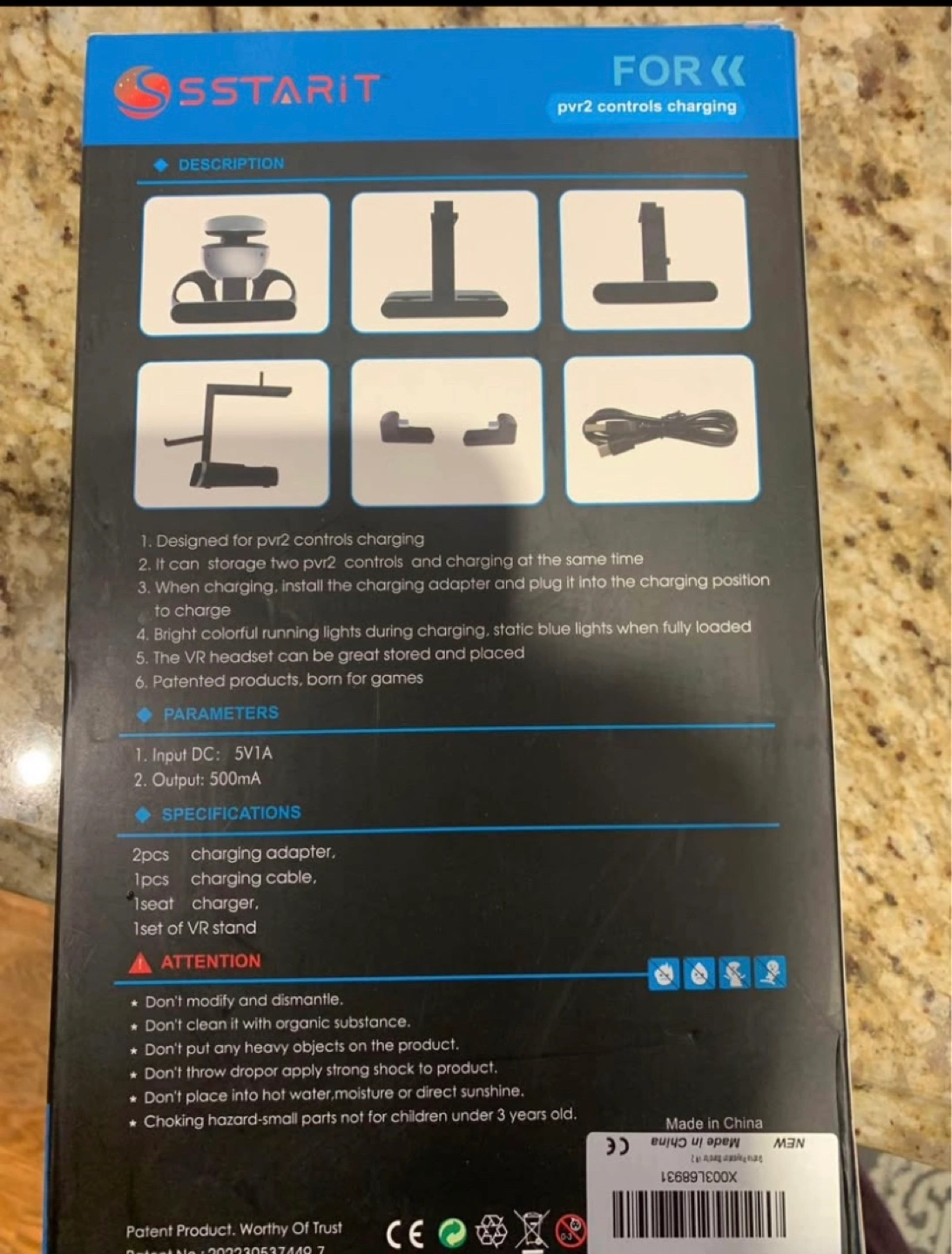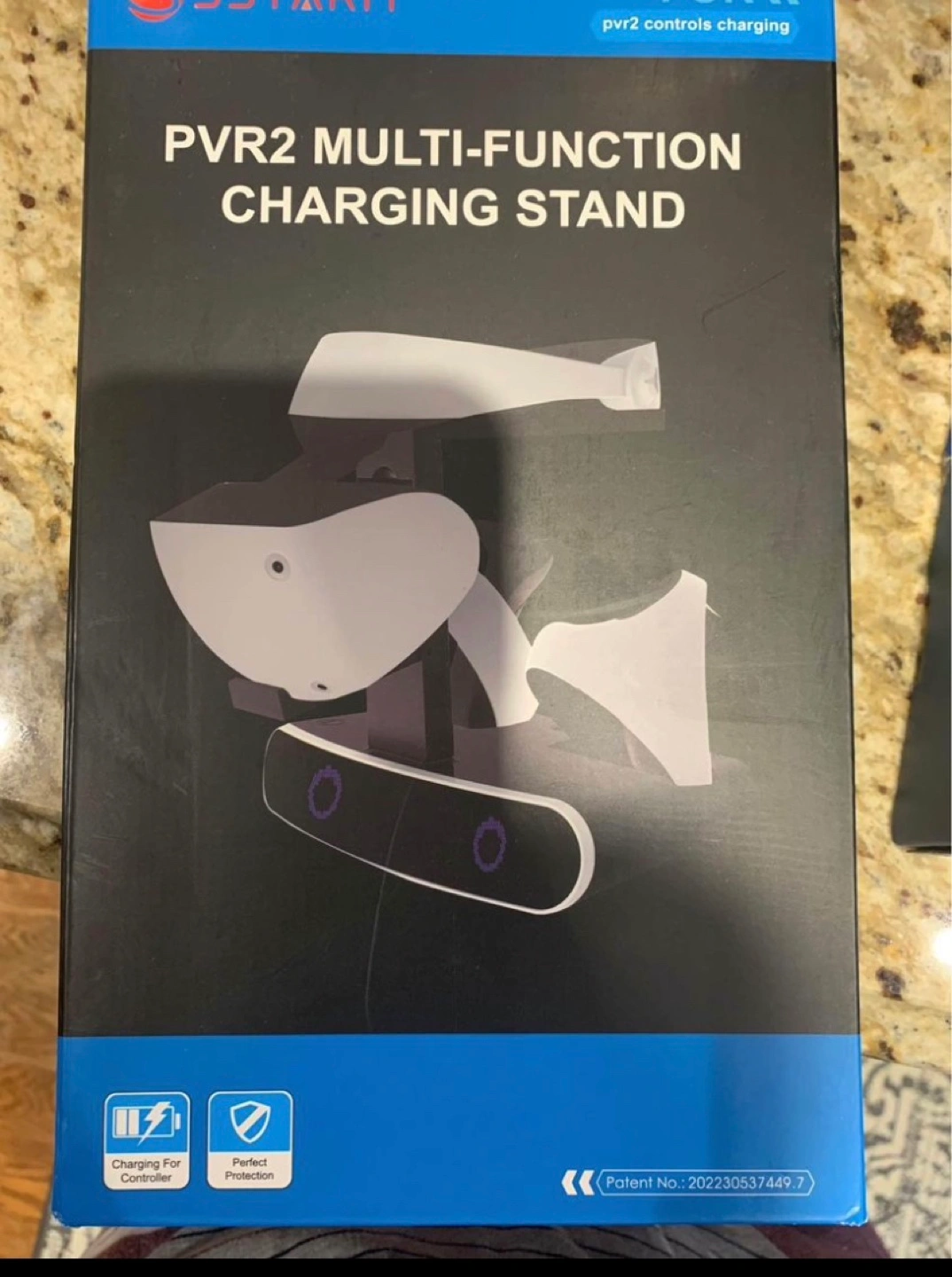 Charging stand for VR controllers. Includes charging cable, charging adapter, and stand. Designed to charge two VR controllers at the same time. Has coloured lights that indicate charging status. Brand new