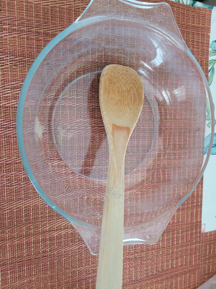 Round small pyres bowl with a wooden spoon . used but in good condition.
