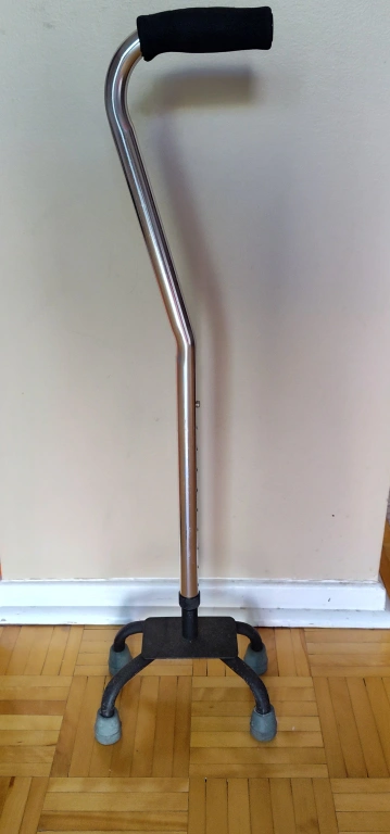 Quad cane walking stick in good condition. It has a comfortable black grip and a sturdy four-point base for added stability. Perfect for anyone needing a bit of extra support!
