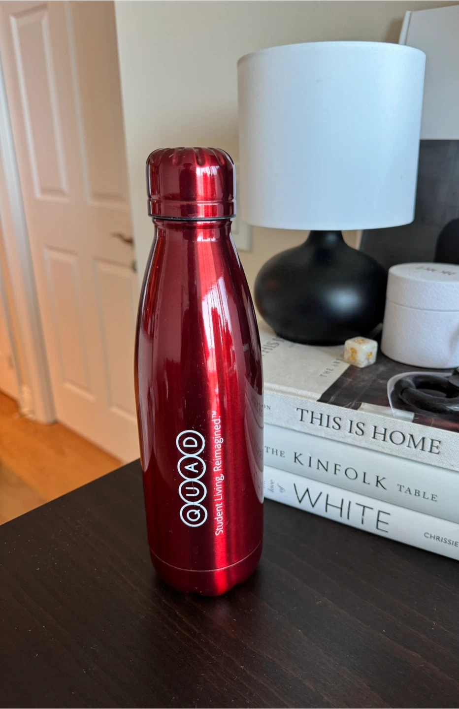 Selling a QUAD Student Living water bottle in red! It's perfect for staying hydrated on the go. It's a great size for carrying around and fits easily in a bag or cup holder. It has some minor signs of use, but is overall in good condition