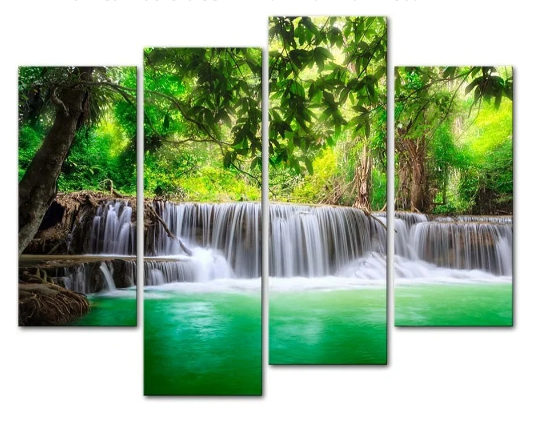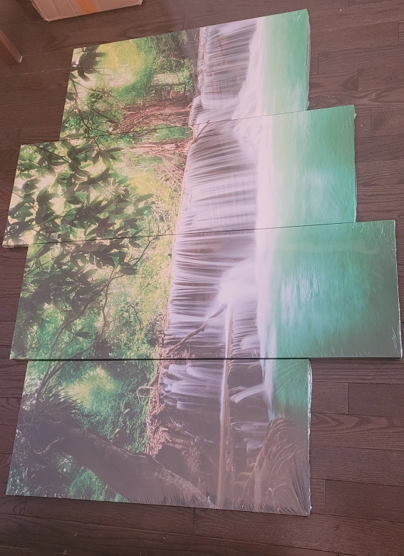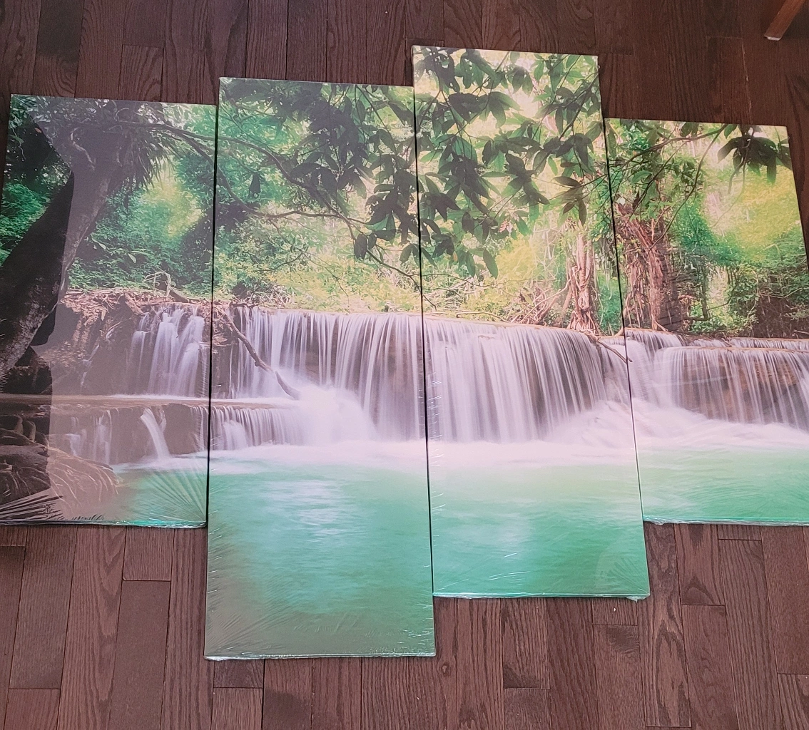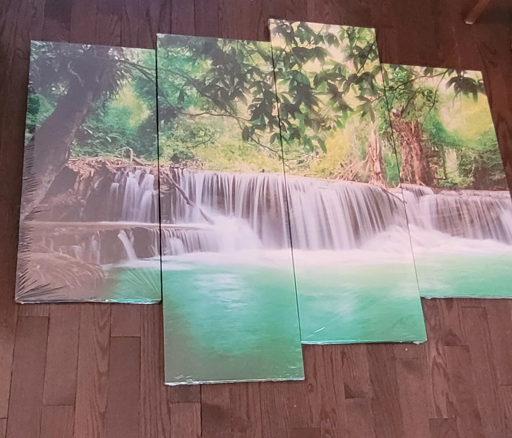 New Four-piece canvas print. Beautiful waterfall scene. Still in packaging. Made in China.