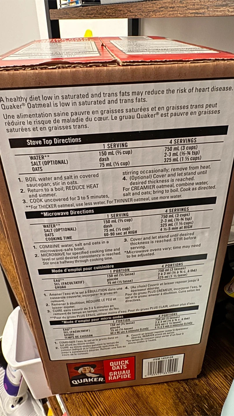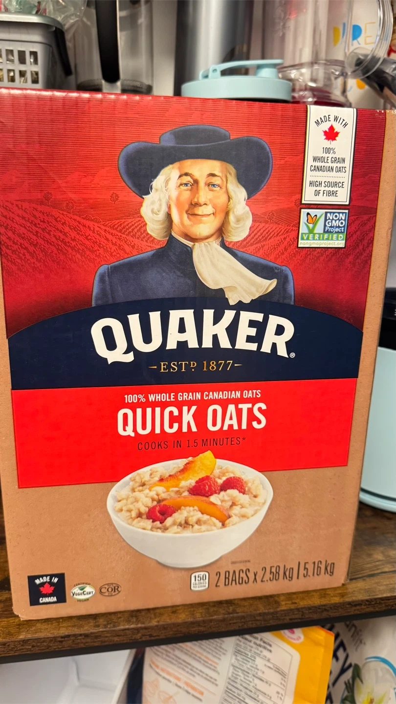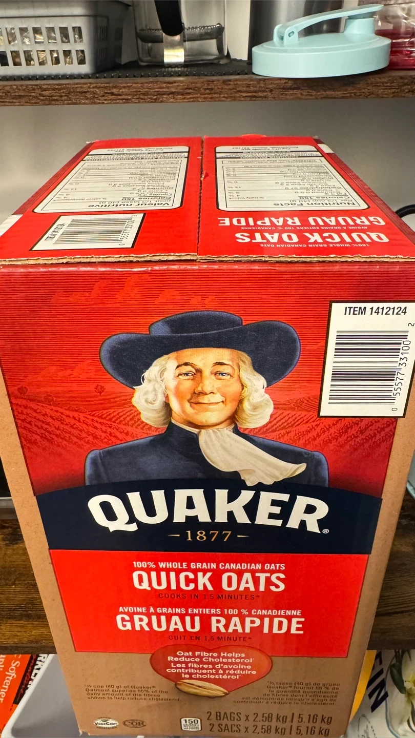 Unopened box of Quaker Quick Oats, containing 2 bags of 2.58 kg each 100% whole grain Canadian oats