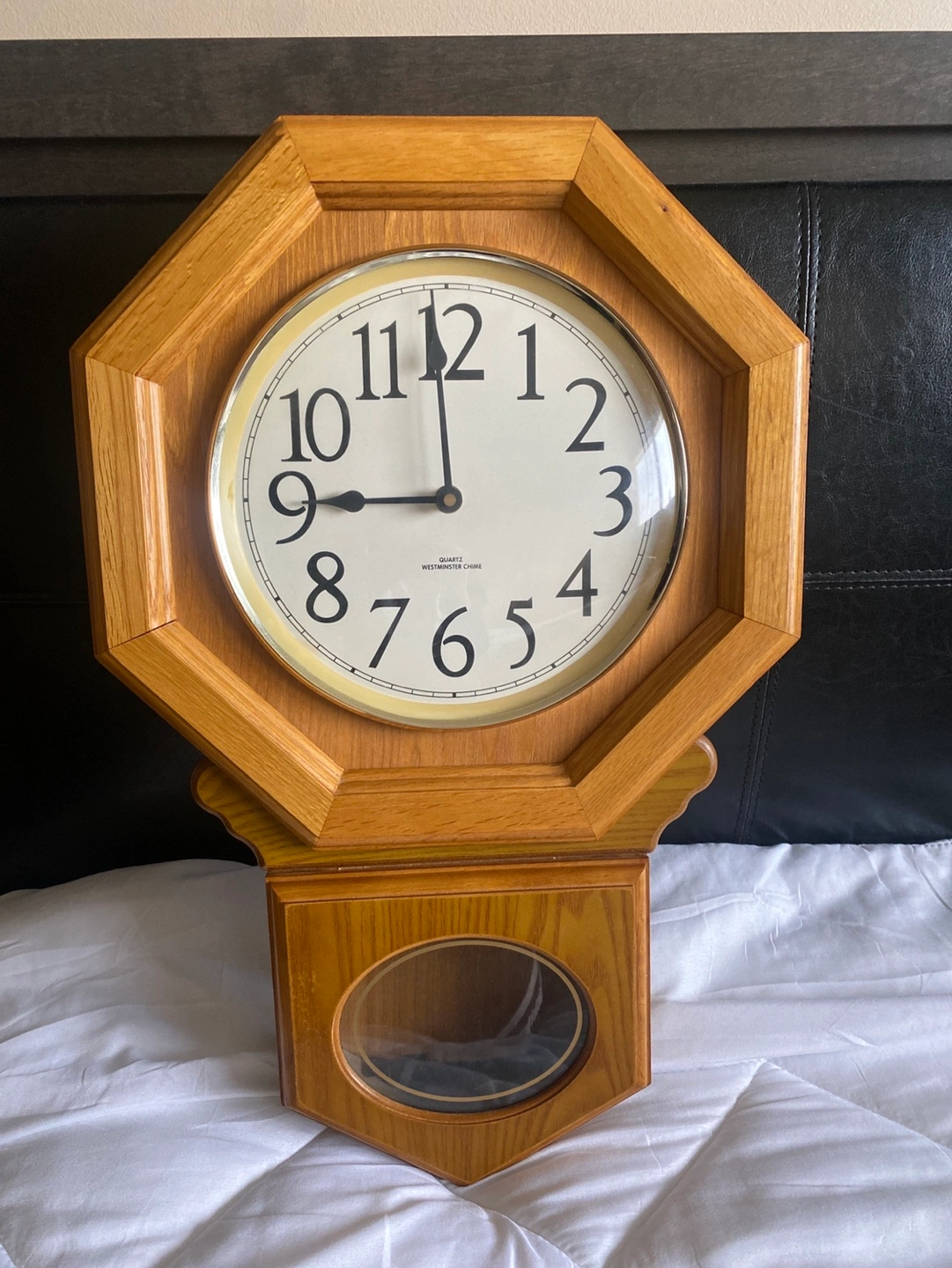 Wooden wall clock, octagonal in shape. Features a quartz movement and Westminster chime. Pendulum included.