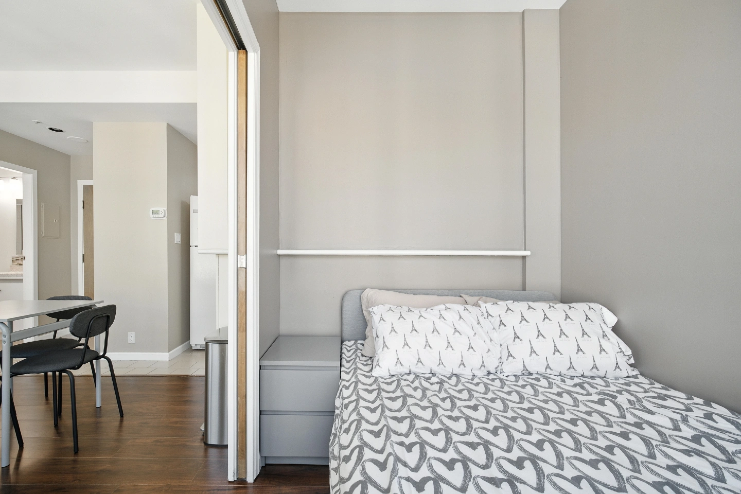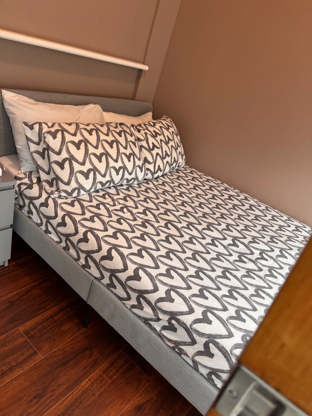 Selling a queen size bed frame and mattress. Queen Size Bed Frame & Mattress $400 Double Size Bed Frame & Mattress $300 Sofa $50 It's in great condition and ready for a new home! The bed features a grey upholstered headboard and a modern design. Perfect for adding a touch of style to your bedroom