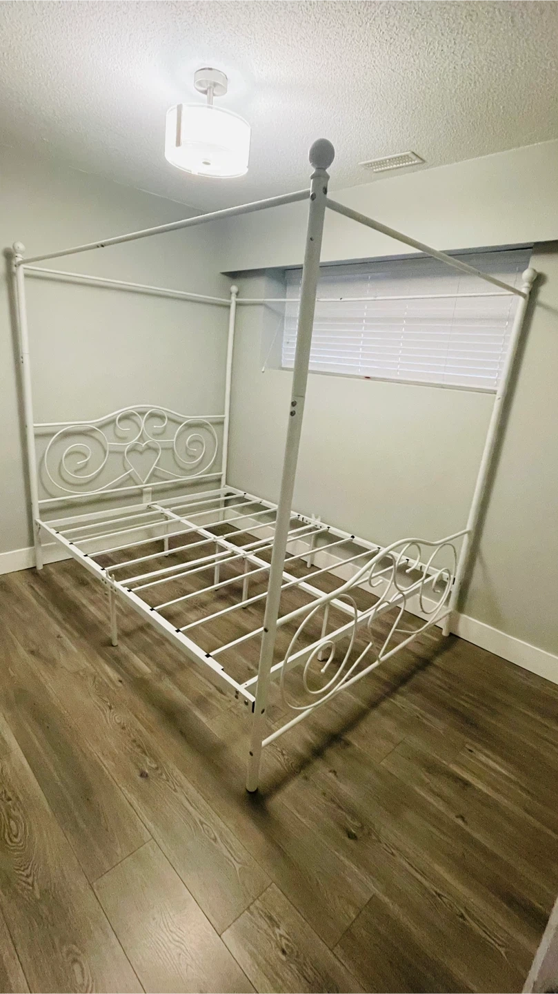 Selling a white metal canopy bed frame along with a mattress. The bed frame features a decorative design and is in good condition. Bed frame -$150 Mattress-$80 Bed frame + mattress - $200 No delivery option available Pickup only