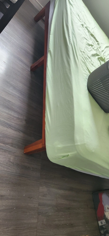 Selling a bed frame with a light green sheet. It's in used condition and has a small tear.