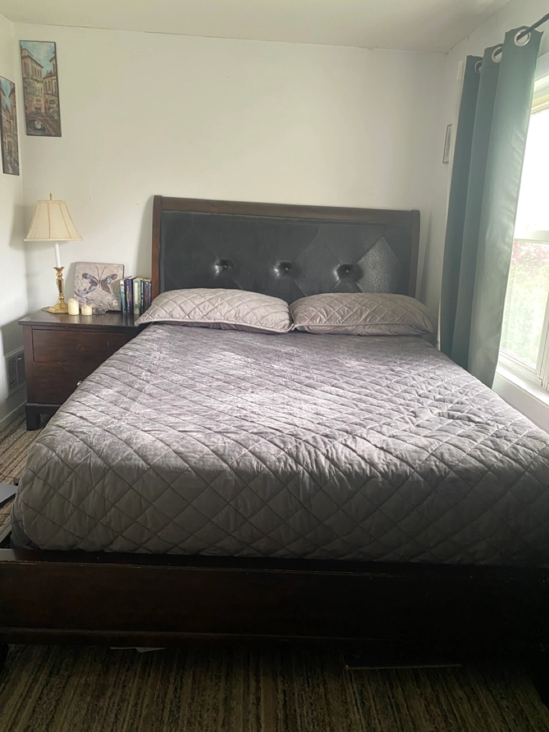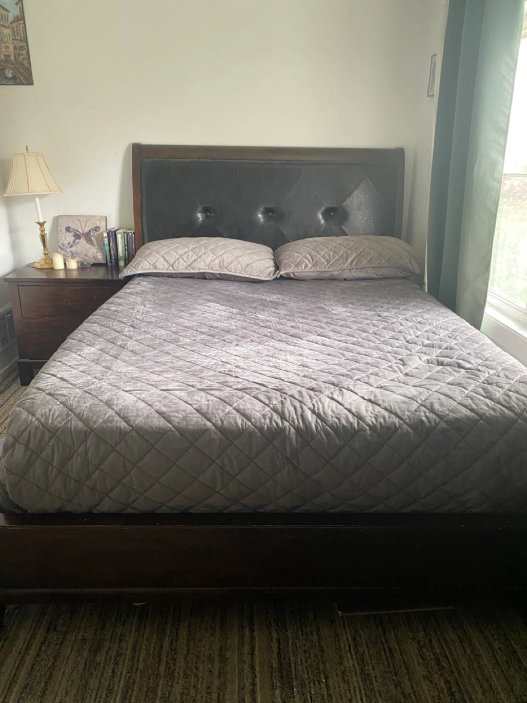 Dark brown wood frame. Queen size bed. Faux leather headboard with button tufting. Solid wood construction. Minor wear from use. Mattress included .