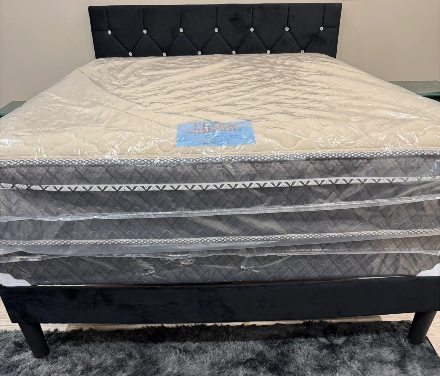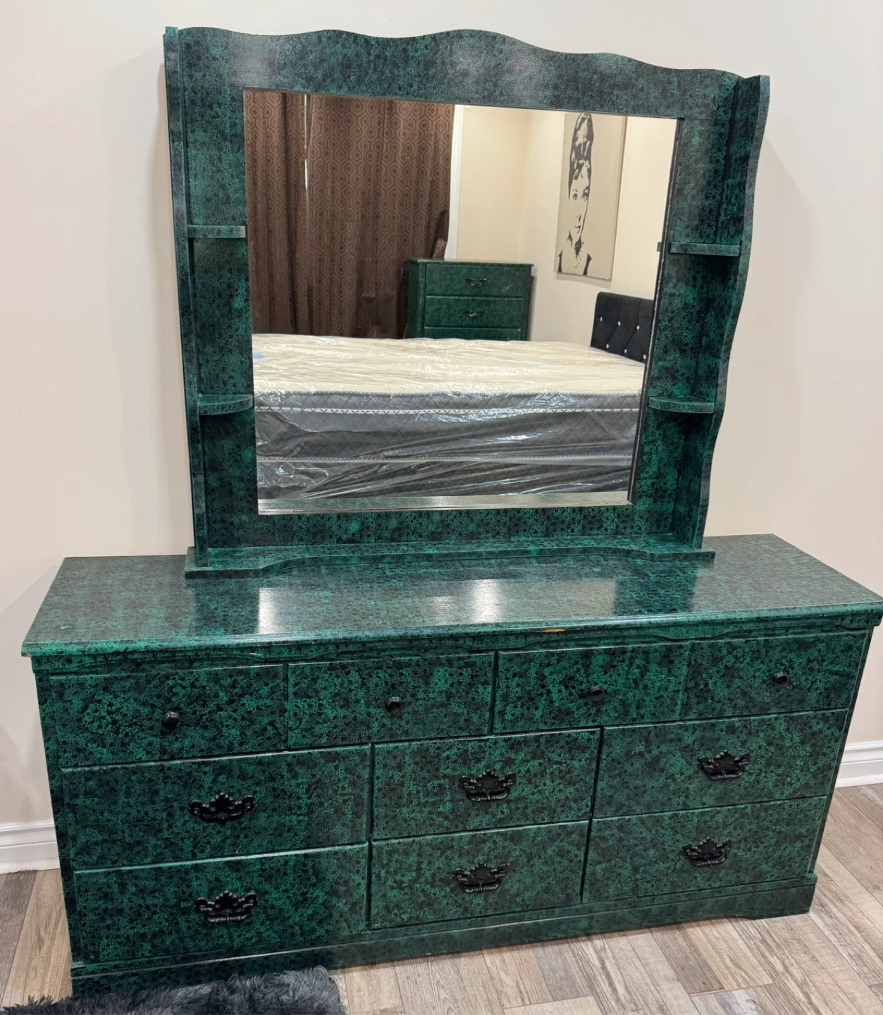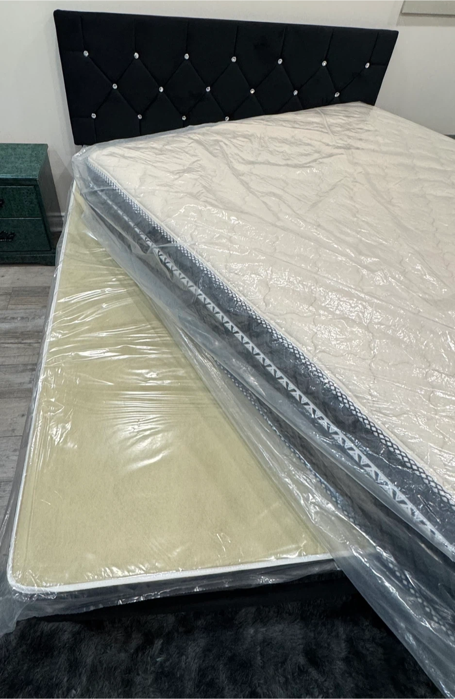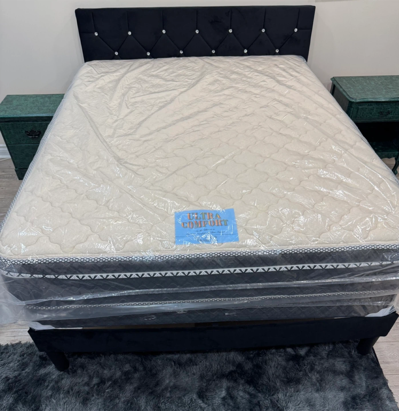 Selling a brand new Ultra Comfort mattress and brand new box spring ! It's still in its original packaging, never been used .Likely Used Bed frame with 2 night stands , 1 Chester draw , and 1 dresser draw with mirror.Comes with a stylish black headboard that features a tufted design with decorative buttons. Perfect for adding a touch of elegance and comfort to your bedroom. Price is negotiable