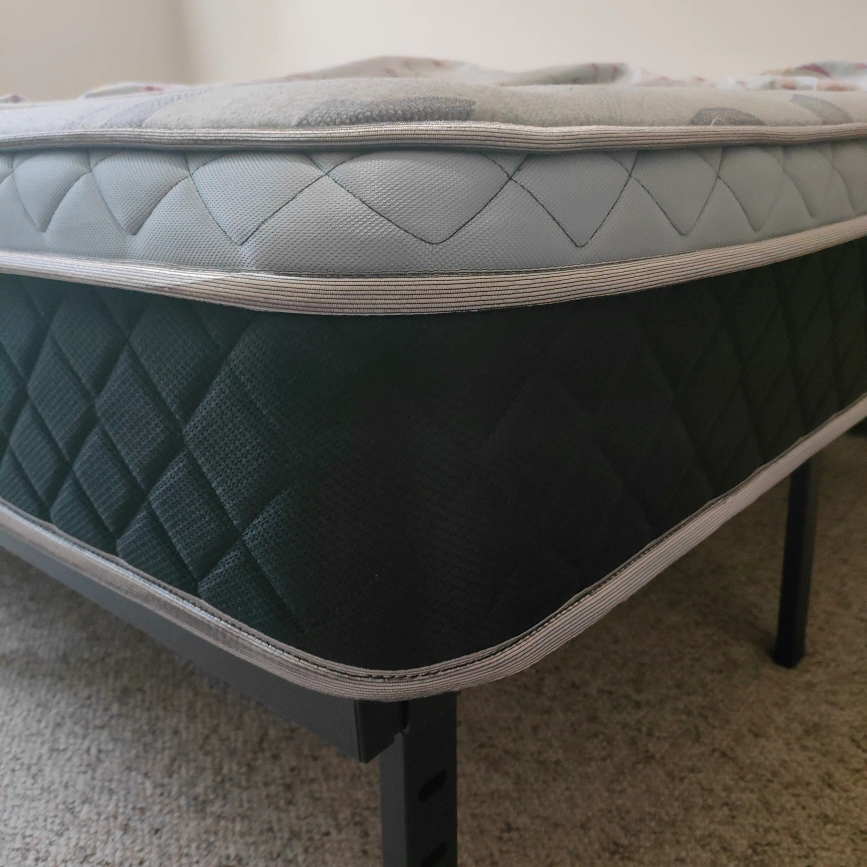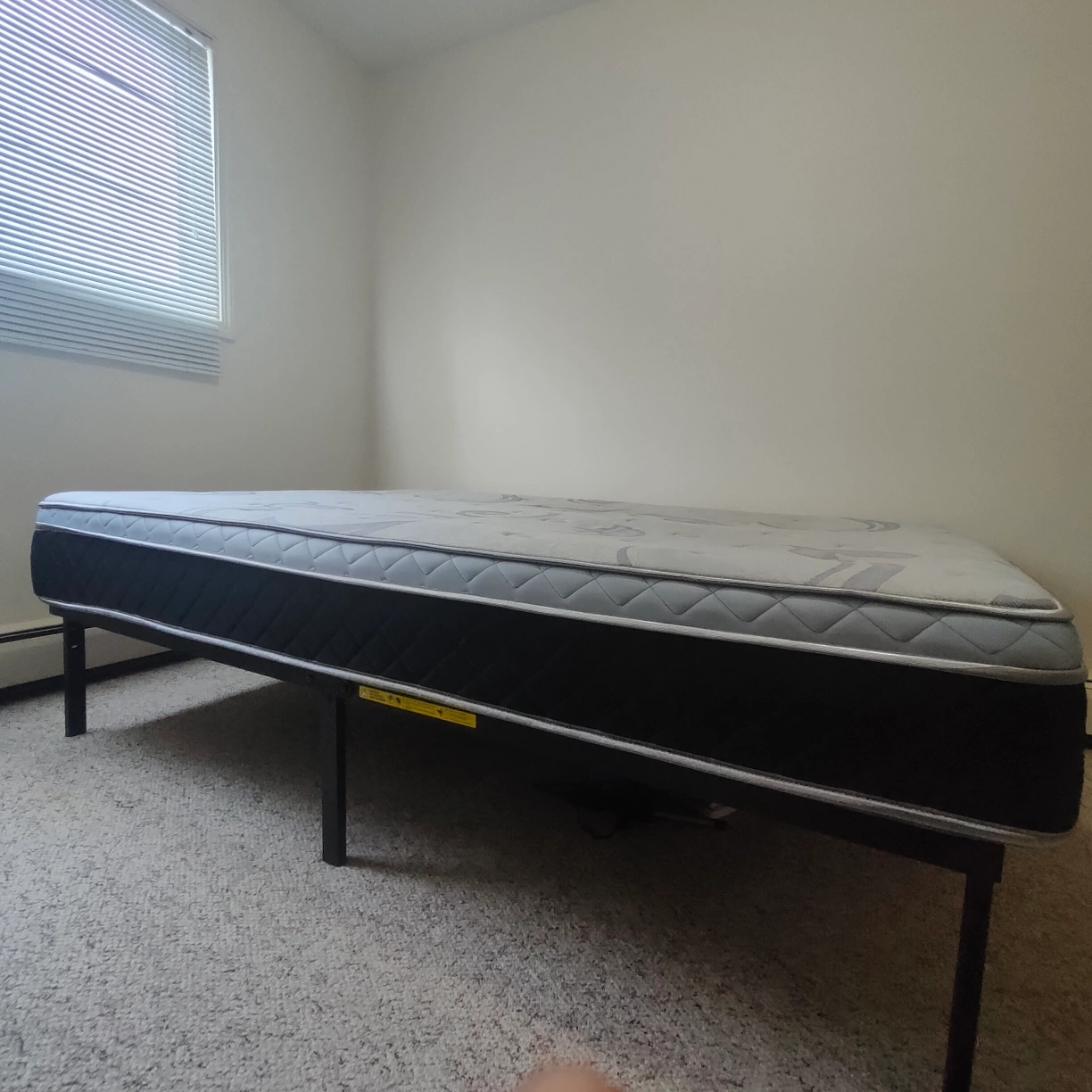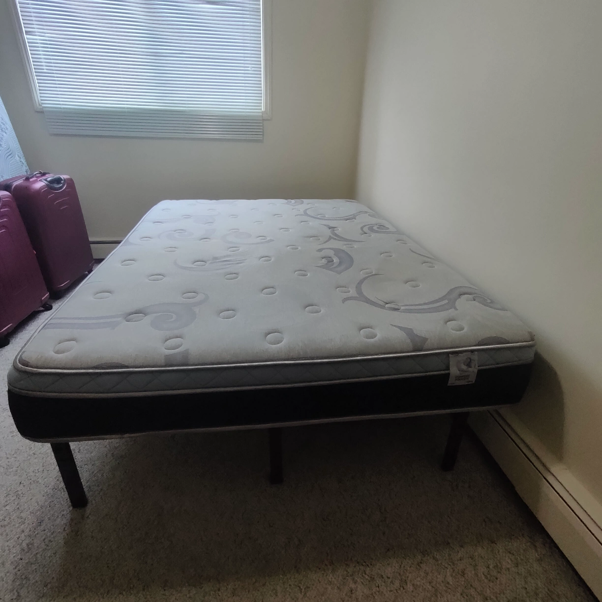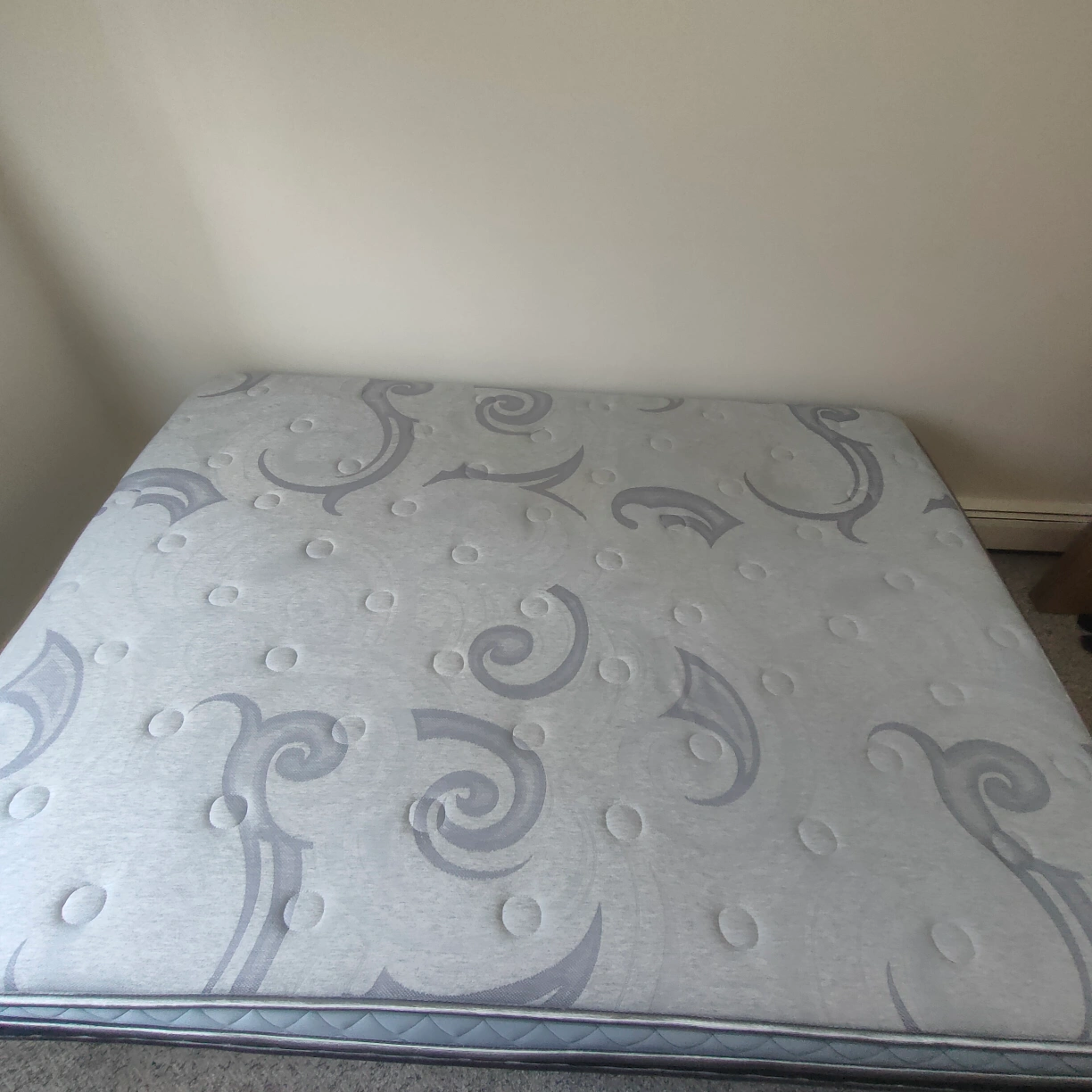 Queen-size mattress. Grey and white patterned mattress. Frame not included. Smoke free. Pet free Dimensions: 60"W x 11.5"H x 79.5"D. Weighs 78 lbs. Pickup only. Cash only