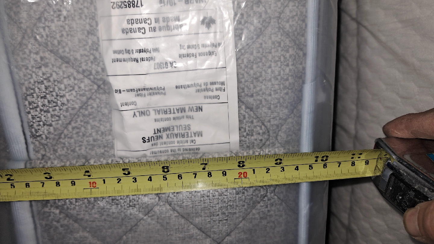 Queen size Mattress with 'New Material Only' tag. Dimensions: - Approximately 75 inches in length - Approximately 59 inches in width - Approximately 9 inches in thickness Material: - Polyester Fiber - Polyurethane Foam - Bio
