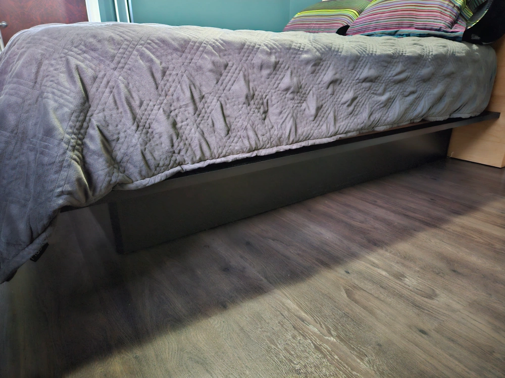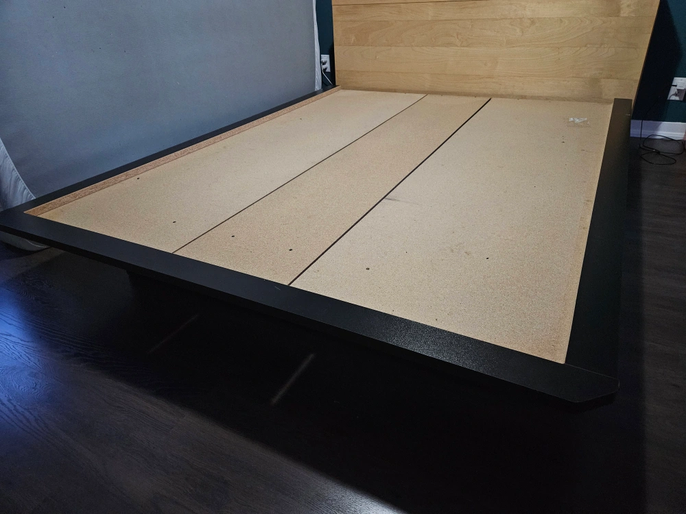 Queen-size platform bed frame, no headboard. Black colour. 11" high. Minimal assembly required. Some minor wear and tear. all ready disasembled. Delivery may be availablefor a small fee, just ask.