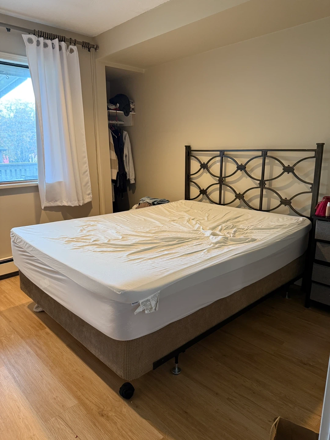 Selling a queen size bed frame with a decorative headboard and a mattress. The bed frame is metal and appears to be in good condition. The mattress is also included, making it a complete set for your bedroom!