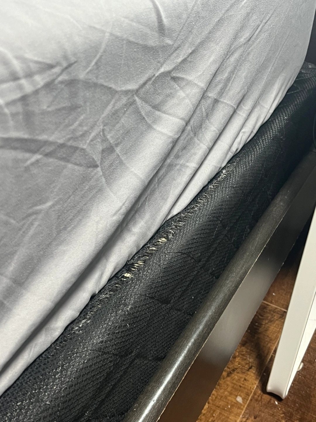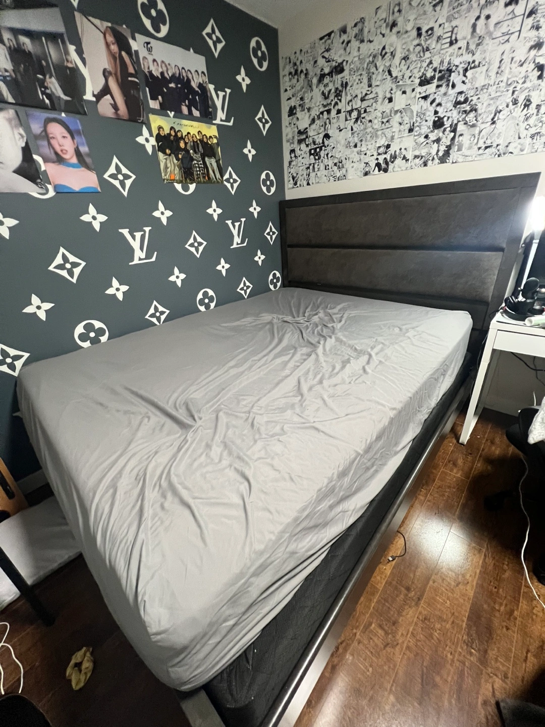 - Good bed frame for queen size bed - Used but is still in good condition - Small tear on the box spring - length: 38.5 in, width 64.6 in, height of the headboard: 54 in with mattress additional $50 need to get rid ASAP can negotiate