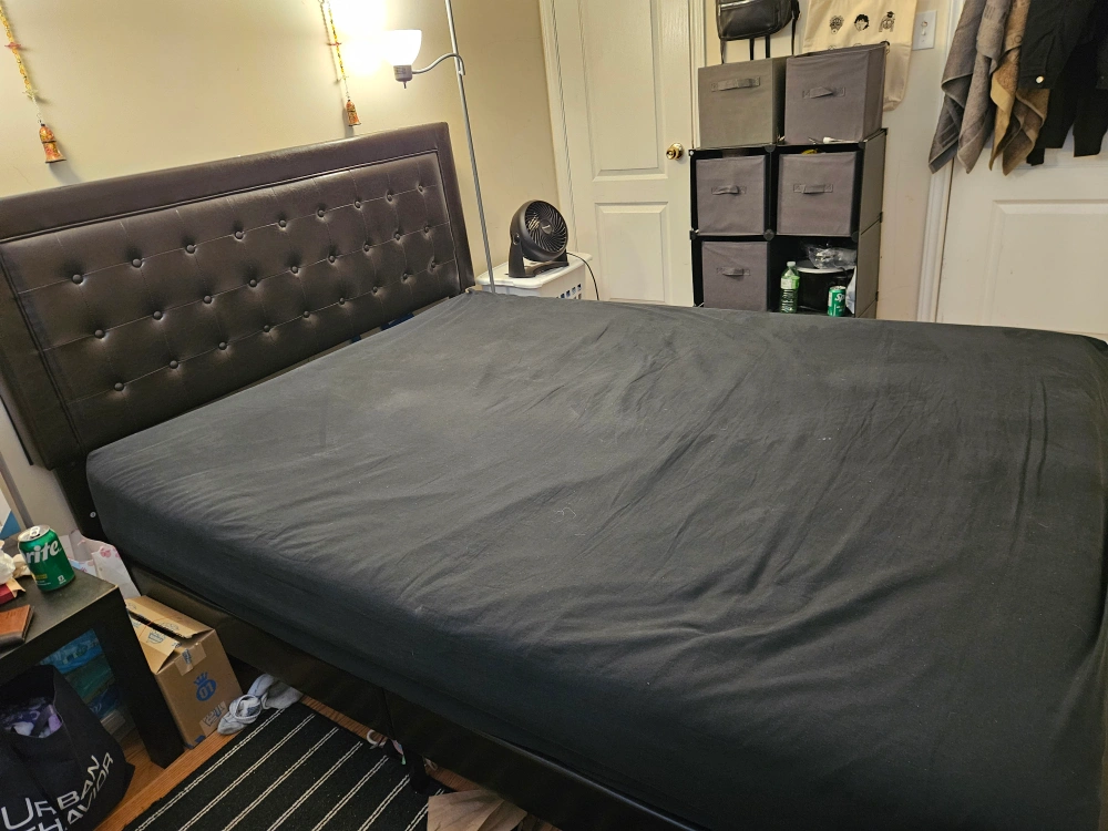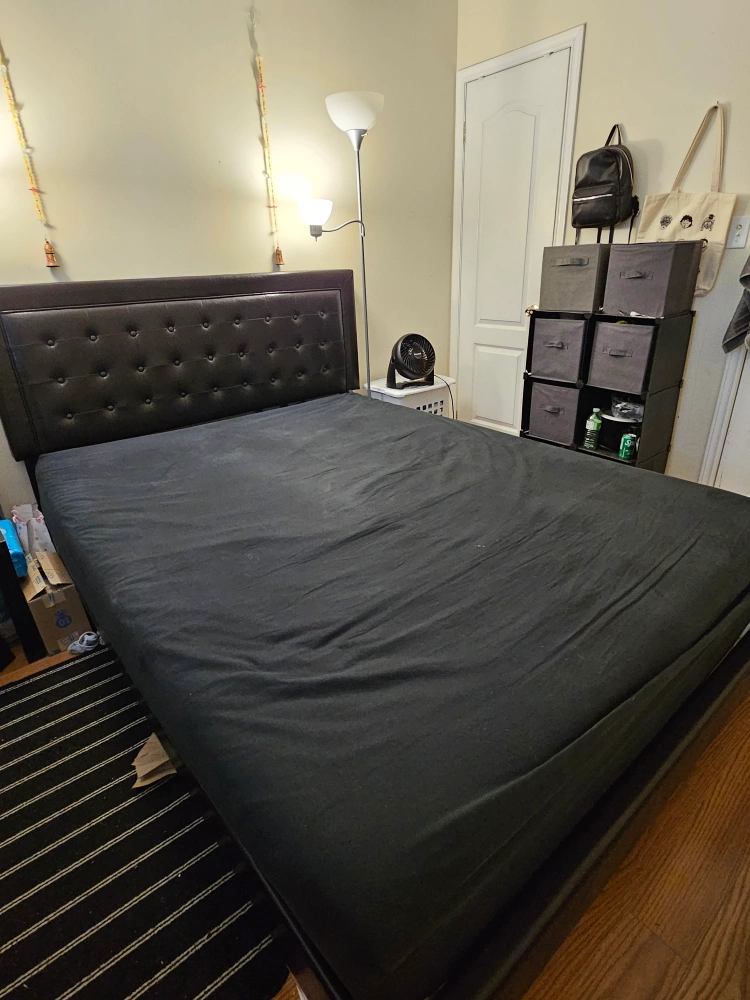 Selling a queen size bed frame with a headboard. It's in good condition and ready for a new home. The headboard is a dark colour with button detailing. Perfect for adding a touch of style to your bedroom!