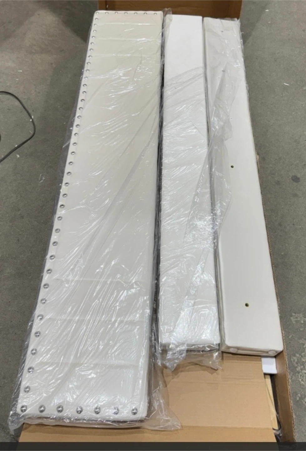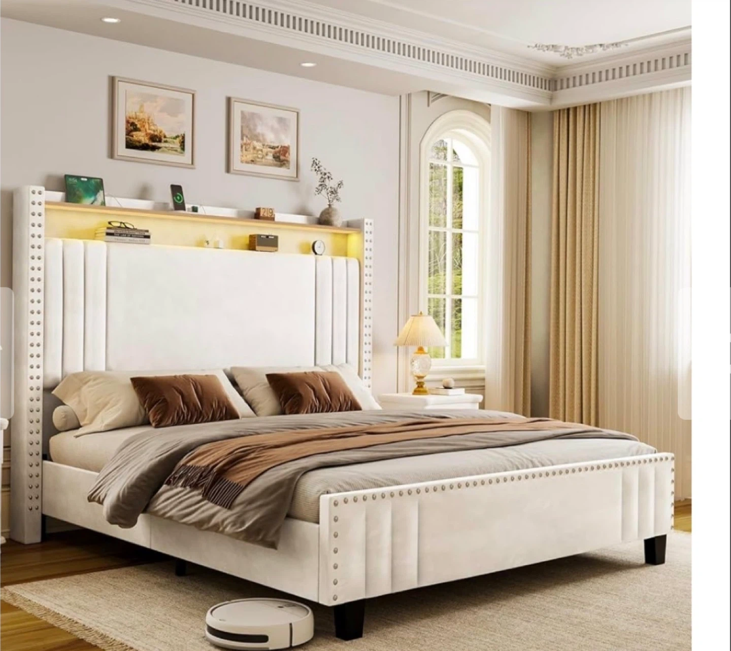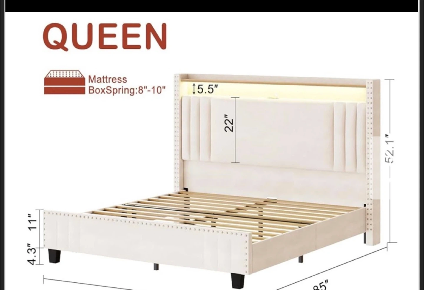 Selling a queen size bed frame. It's in mint condition and comes with the box and all components. The frame is a beautiful white colour and would look great in any bedroom! ROLETALENT queen bed frame in white! This bed frame features a storage tall headboard and LED light, perfect for adding a touch of modern elegance to your bedroom. The velvet upholstered frame includes a charging station. It fits a queen size mattress and box spring from 8"-10". The dimensions are approximately 85" in length and 52.1" in height Pet &!Smoke free home Pick up in Auburn Bay SE