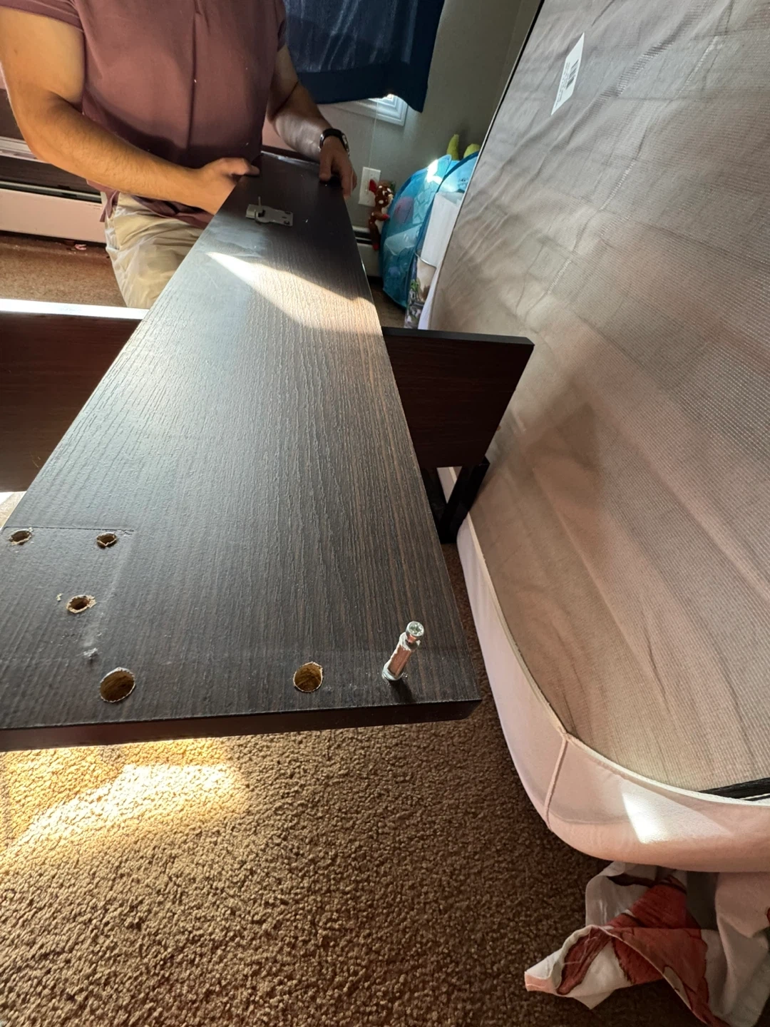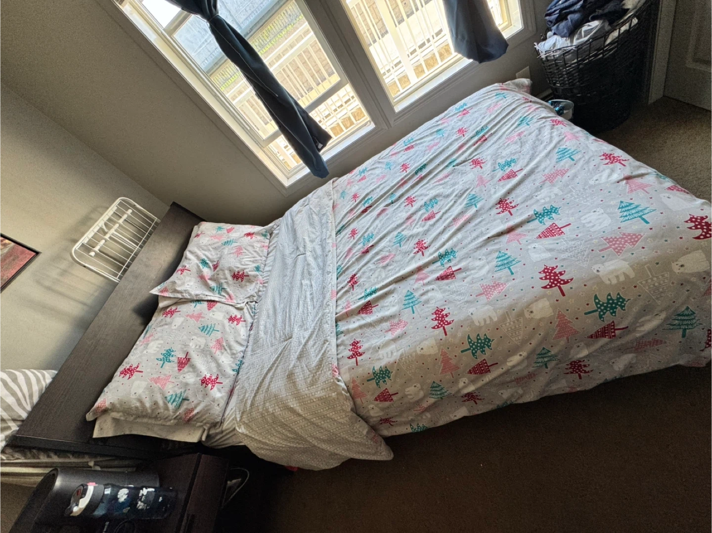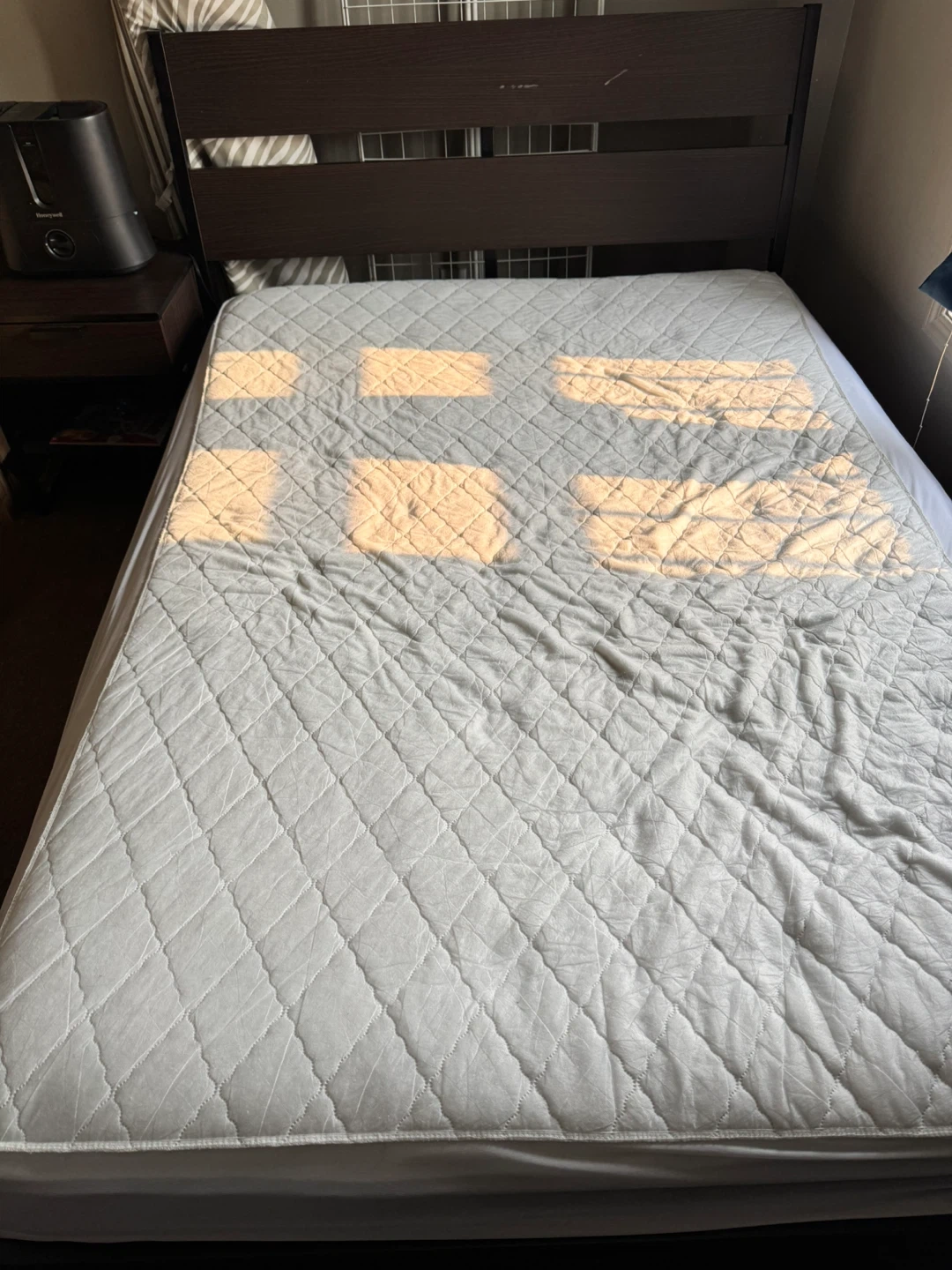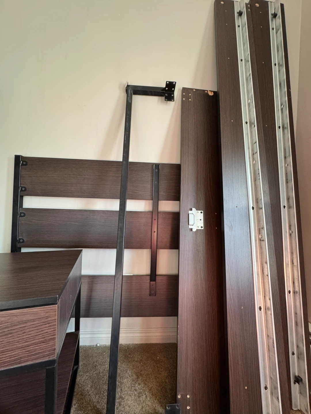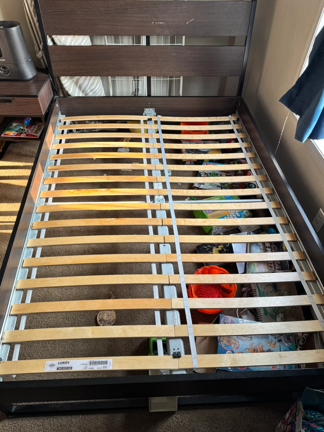 Selling a full size XL size bed frame. The product dimensions are: - Length: 81 7/8" - Width: 55 1/8" - Footboard height: 15 3/4" - Headboard height: 38 5/8" MOVING - IKEA brown Bed frame . Minor scuffs please refer to the pics. From Smoke and pet free home Only selling bed frame. Can include the mattress as well for extra 50$ Night stand 10$ Pick up Auburn Bay SE