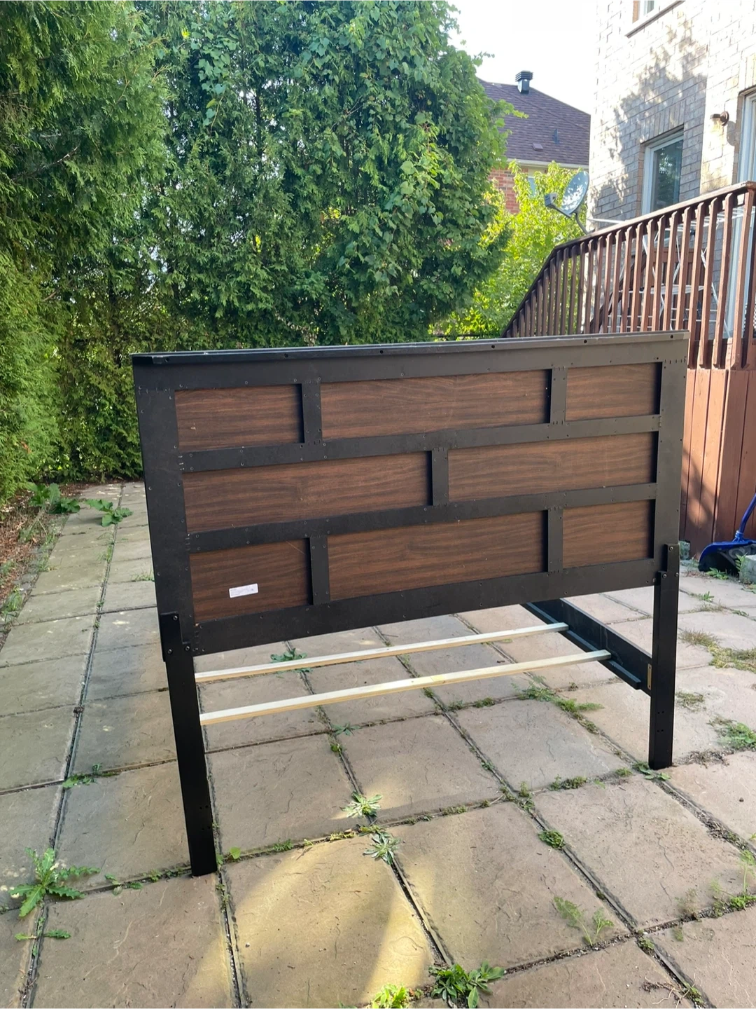 Selling a queen size bed frame in excellent condition. The frame has a unique, stylish headboard design with a dark wood and black metal finish. Perfect for adding a touch of modern flair to your bedroom! Was used as a guest bed and rarely ever slept on!