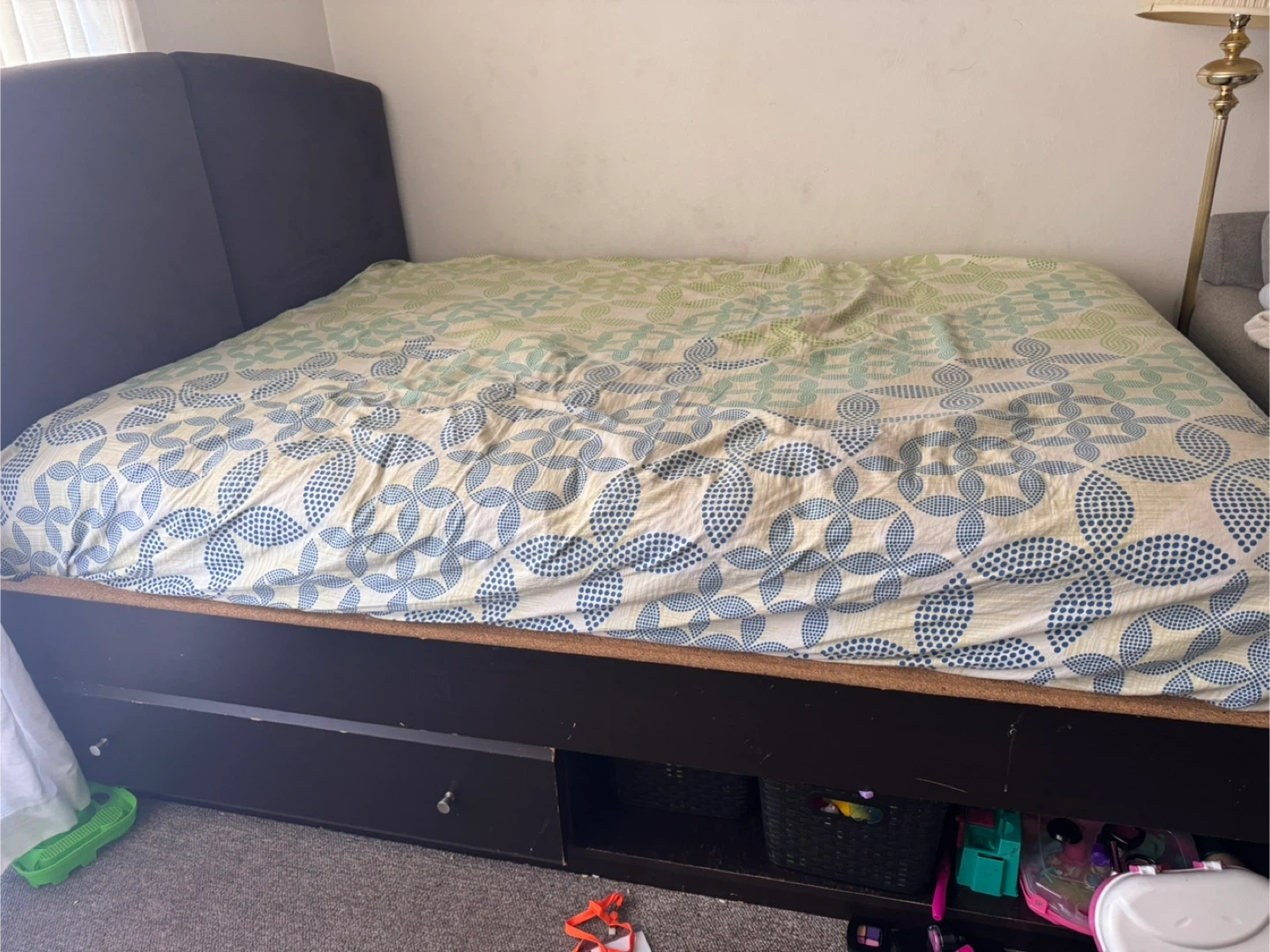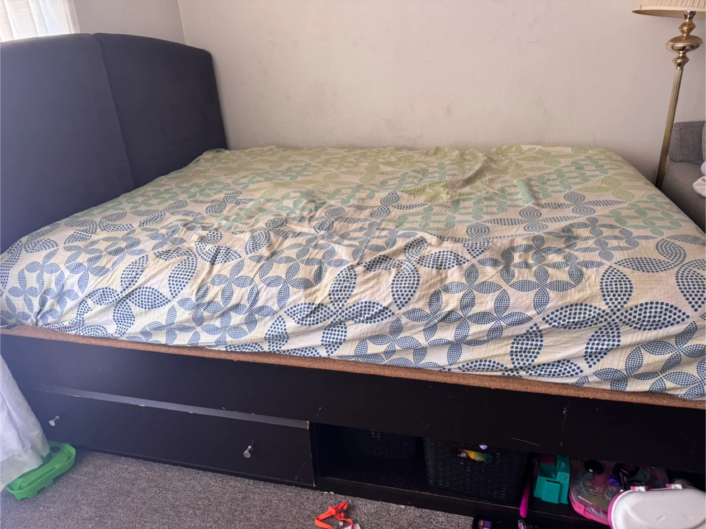 Selling a queen size bed frame and mattress that comes with a headboard and built-in storage! It's in good condition and perfect for adding extra space to your bedroom. The dark brown finish gives it a sleek and modern look. Great for anyone looking for a functional and stylish bed frame!