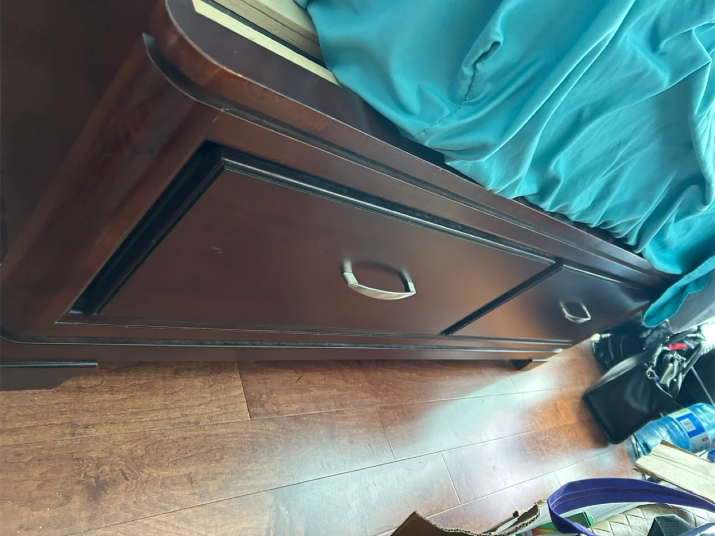 PICK UP - September 30 Solid Oakwood Queen Bedframe – Must Go! Sturdy queen-size solid oakwood bedframe with headboard and 2 built-in drawers. . Strong, stylish, and built to last. Moving soon, so letting it go at a great price. . Mattress not included. We already dissemble it. It’s 4 pieces -headboard -2 side panels -2 built in drawer -bed frame Selling a queen size bed frame! It's a dark wood finish and includes storage drawers built into the base. Perfect for maximizing space in your bedroom.