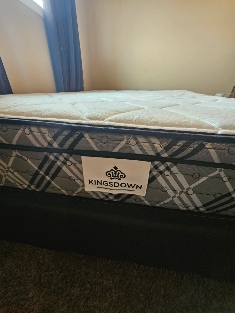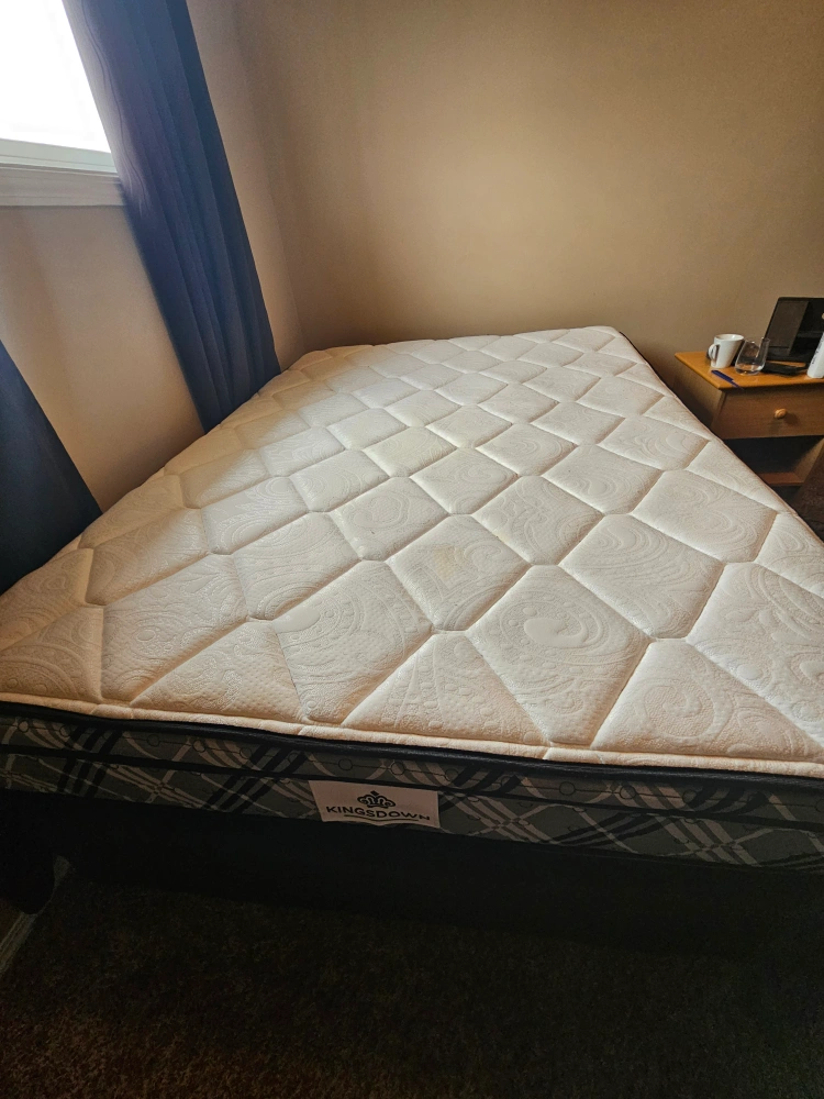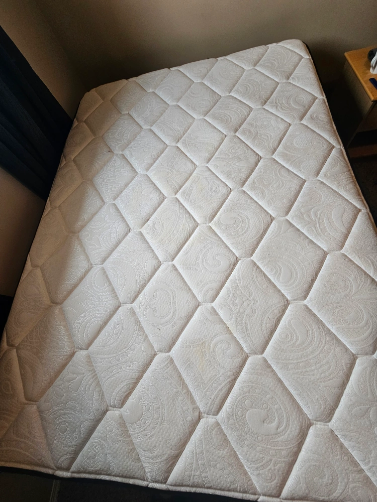 Used but protected queen size mattress with a black and grey patterned cover and metal frame.