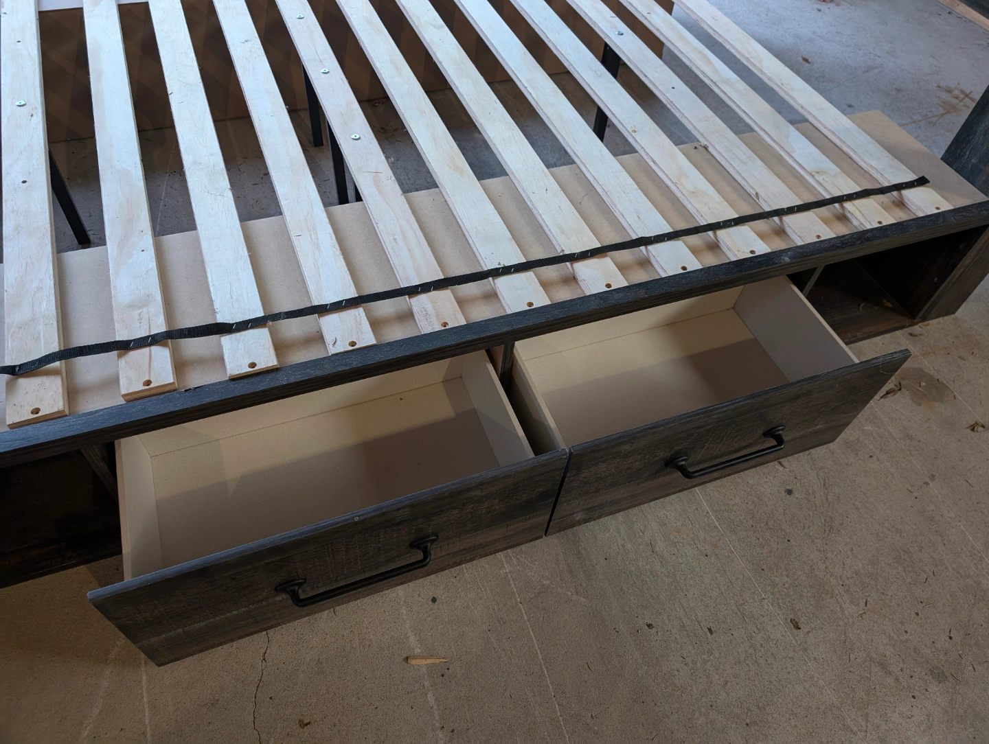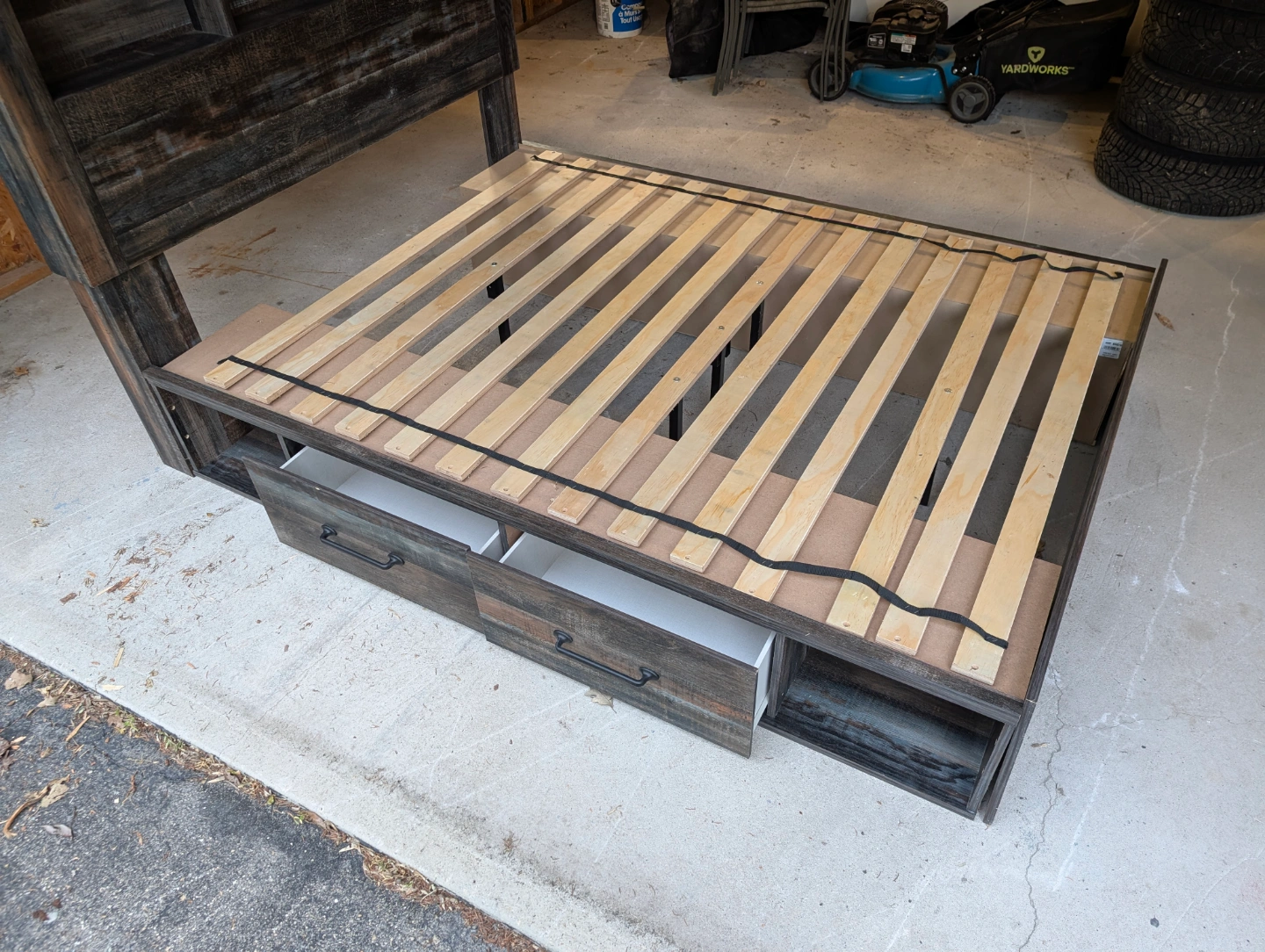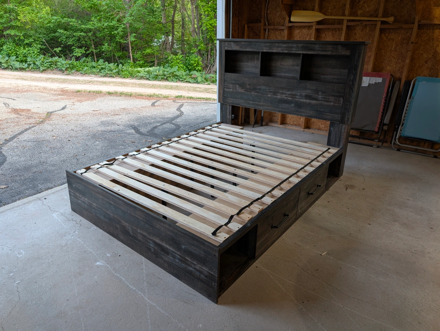 "Drystan" queen bedframe with bookcase headboard and storage. Good overall condition, a couple small scuffs and two drawers have some minor damage (all pictured). Headboard has integrated LED/basic RGB lighting. Purchased from Ashley furniture about 3 years ago(approximately $1500, has been in storage since last summer. Currently disassembled, pictures show current condition. Pickup only.