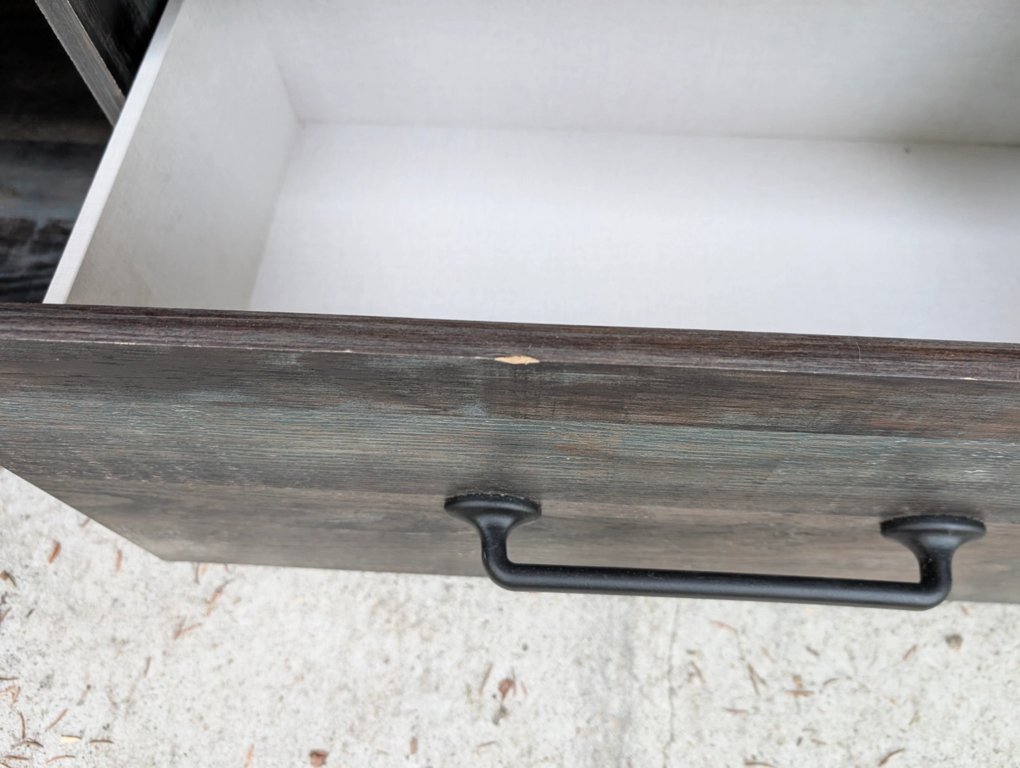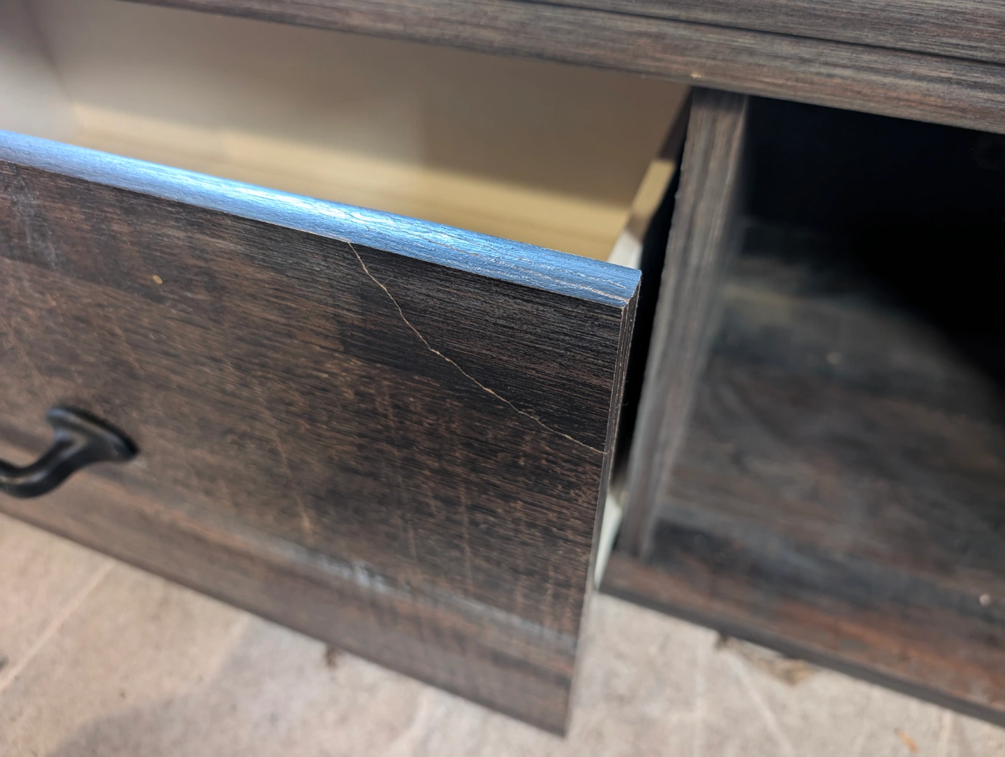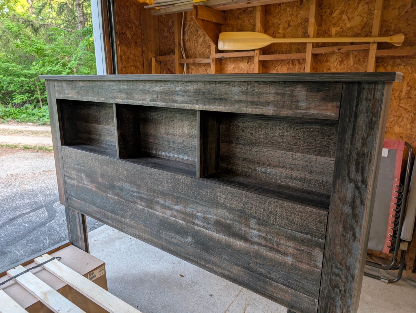 "Drystan" queen bedframe with bookcase headboard and storage. Good overall condition, a couple small scuffs and two drawers have some minor damage (all pictured). Headboard has integrated LED/basic RGB lighting. Purchased from Ashley furniture about 3 years ago(approximately $1500, has been in storage since last summer. Currently disassembled, pictures show current condition. Pickup only.