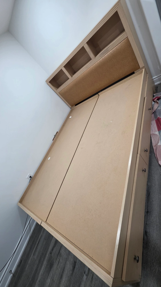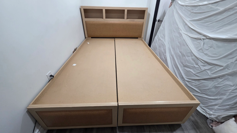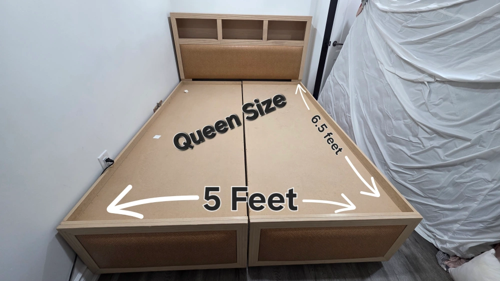 Queen Size Wooden Bed with Storage – Strong & Budget Friendly (price negotiable) ✅ Size: Queen (5 ft wide x 6.5 ft long) ✅ Material: Solid, strong wooden build – very durable ✅ Headboard: Stylish with open shelves for books, decor, or storage ✅ Storage: Built-in drawers on one side (2 drawers present, 2 drawers missing on the other side) ✅ Condition: Excellent – no wear and tear, sturdy structure ✅ Low cost & budget friendly – great value for money This bed is perfect for anyone looking for a reliable, long-lasting, and affordable bed with extra storage space. Just place your mattress on top and it’s ready to use.