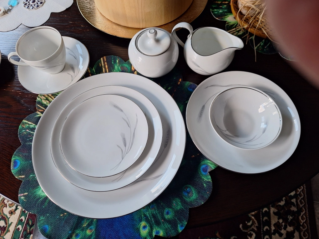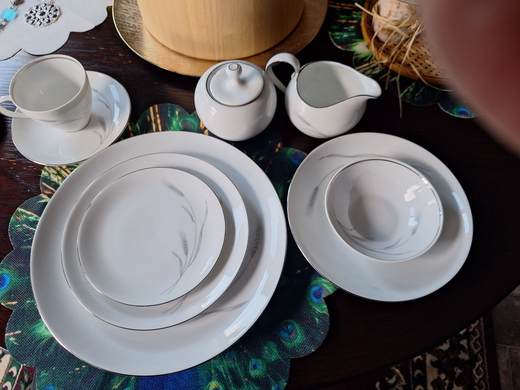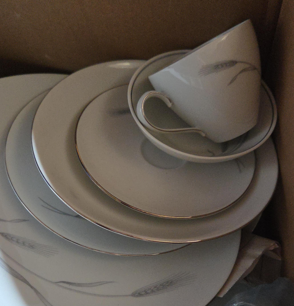 Selling a beautiful Queen's China dinnerware set with a delicate wheat pattern. It includes plates, bowls, cups, and saucers. Perfect for adding a touch of elegance to your dining table!