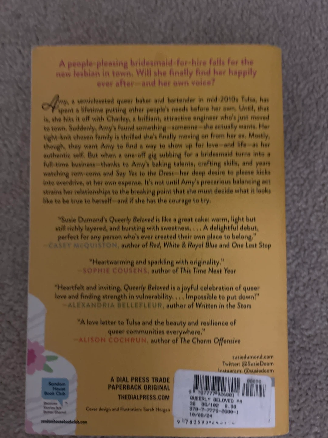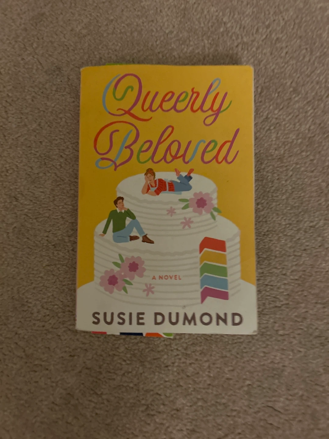 Selling a copy of Queerly Beloved by Susie Dumond. It's a novel with a bright yellow cover and a cute illustration! The story is about a queer baker in Tulsa. Perfect for a light and heartwarming read