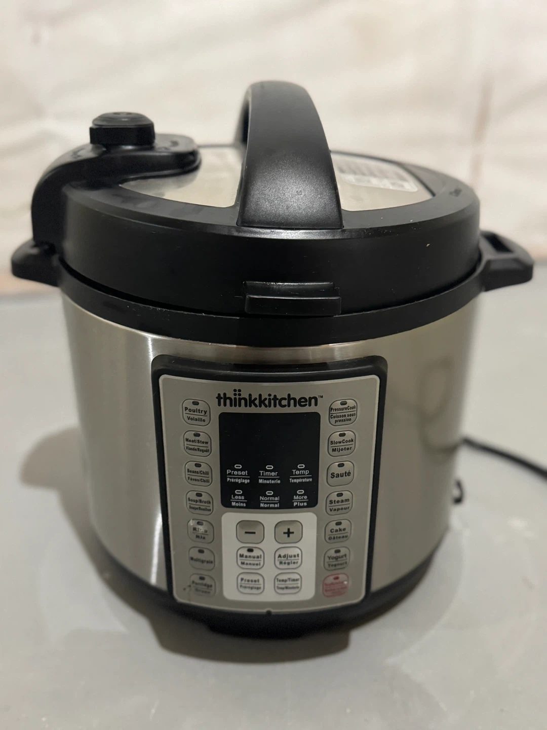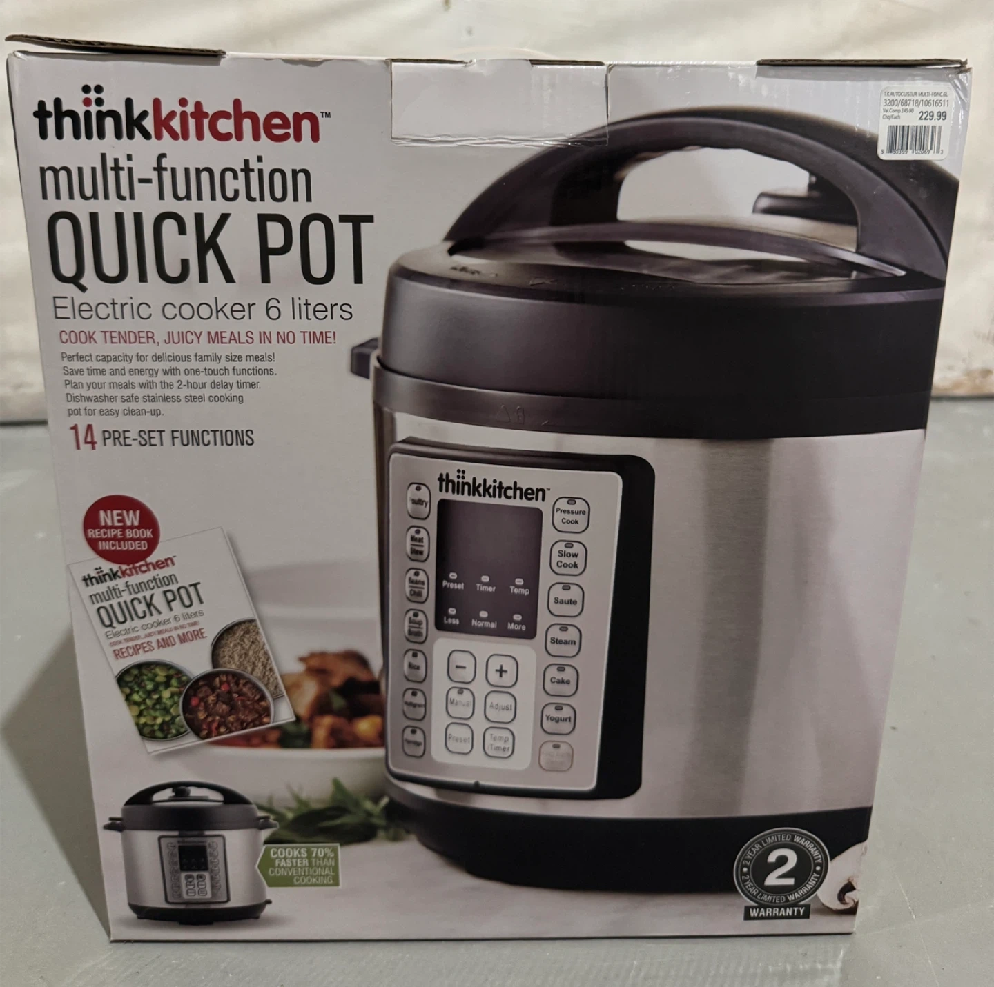 I'm selling a Thinkkitchen multi-function quick pot. It's an electric cooker with a 6-litre capacity. It's perfect for family-size meals! It can cook tender, juicy meals in no time. It has 14 pre-set functions and a dishwasher-safe stainless steel cooking pot for easy clean-up. A new recipe book is included as well!