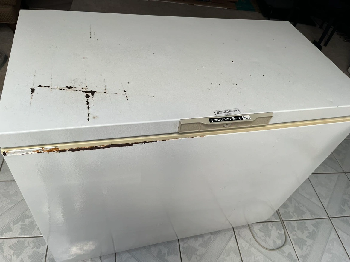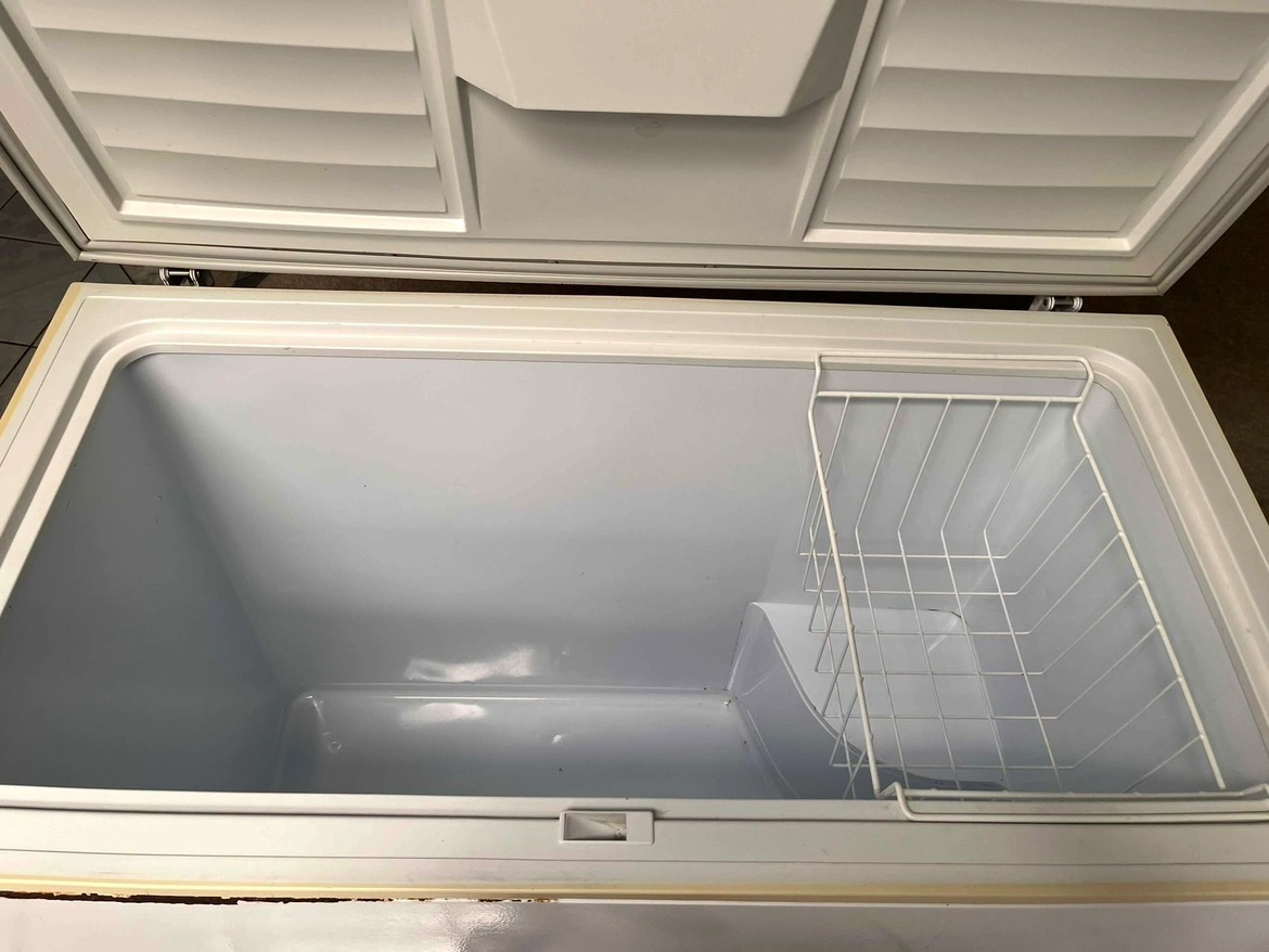 This chest freezer has a wire shelf and is in good working condition. It does have some cosmetic damage to the exterior. 107x85x55cm