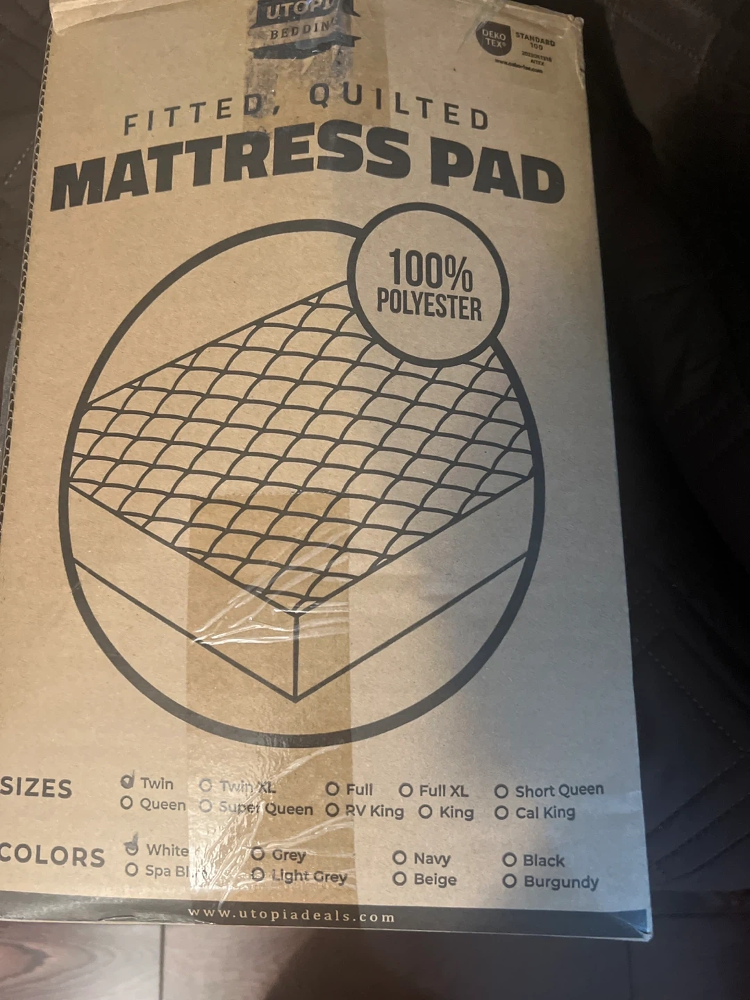 This is a Utopia Bedding fitted, quilted mattress pad. It's made of 100% polyester and fits Twinsized bed. The deep pocket design fits mattresses 8-16 inches deep. It's white in colour and comes in its original box