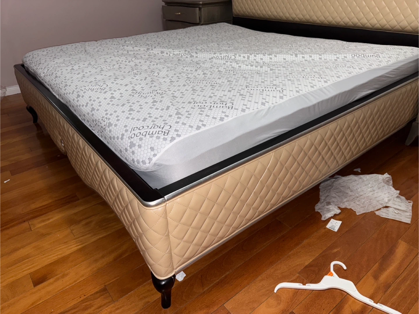 Selling a stylish bed frame featuring a quilted italian leather design. It's in great condition and ready to add a touch of elegance to your bedroom. The bed frame has a unique headboard with detailed accents. It's a California king size bed.