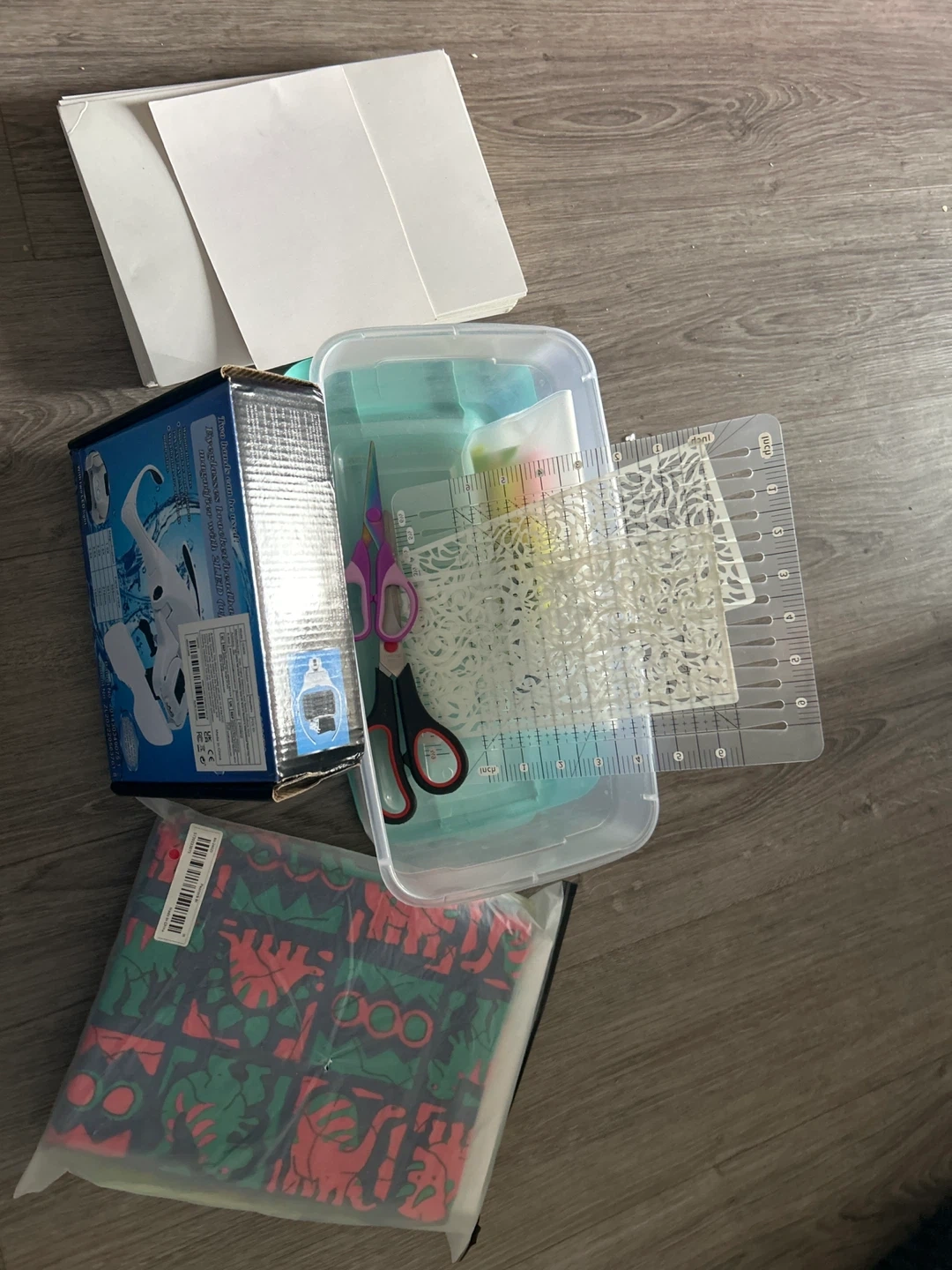 Selling a quilting batch. Great for quilting, scrapbooking cardmaking projects! Contents: $ lot of comic book cardboard for nice storage $ fabric -enough for a child style project $ headset of magnifier for the smallest task $ tool to make perfect squares and such $ perfect size container with lid for the project Firm price $10