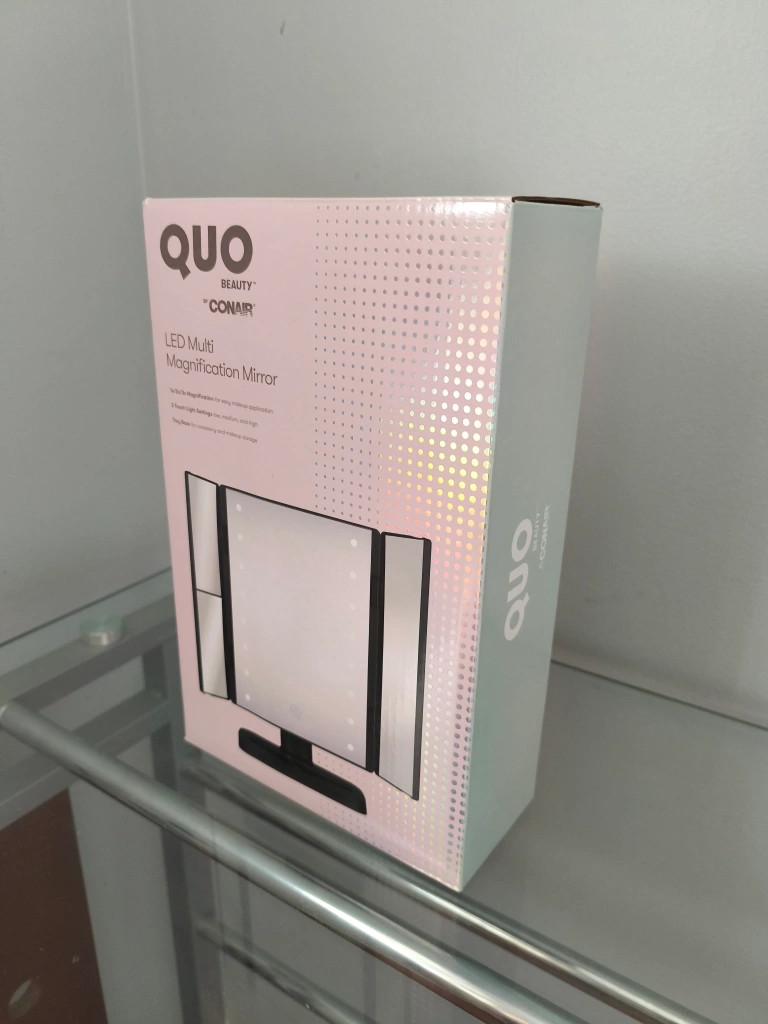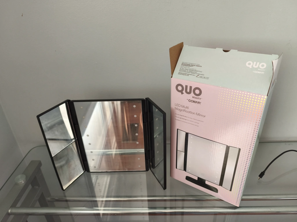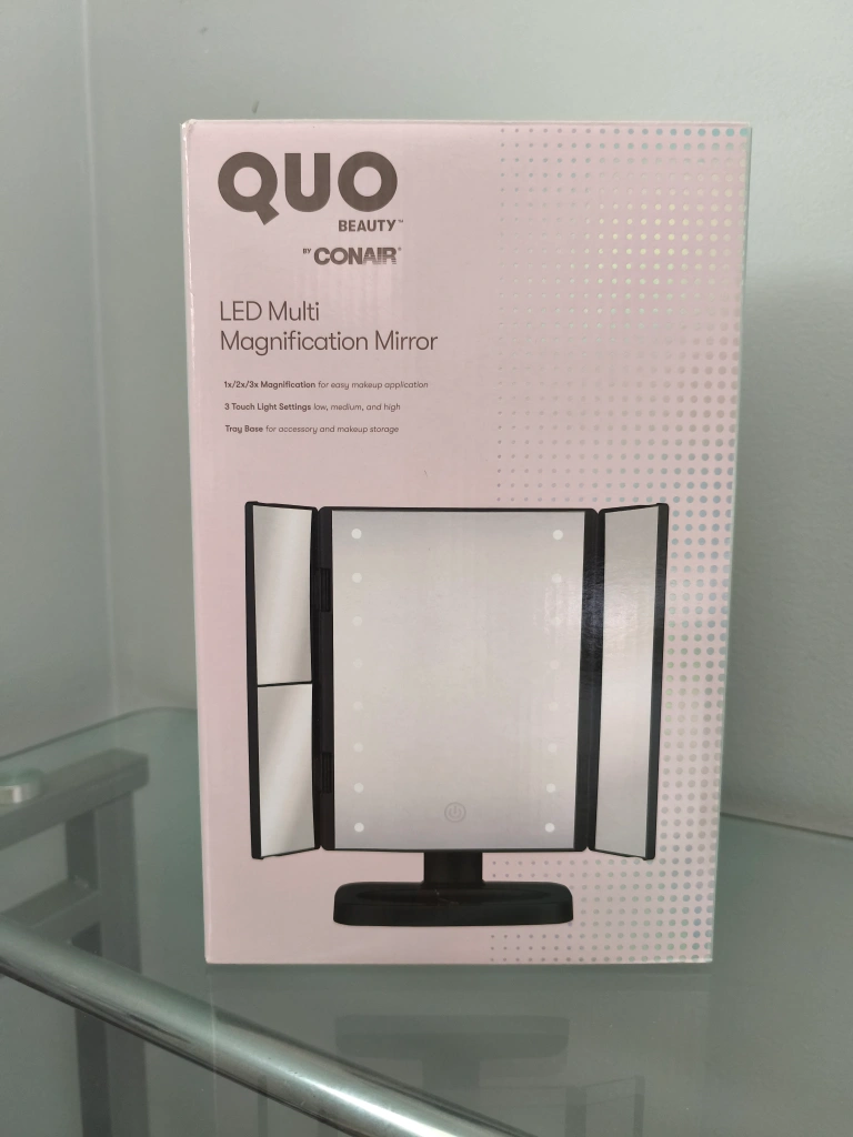 Selling a barely used, like new, QUO by Conair LED Multi Magnification Mirror. It has 1x/2x/3x magnification for easy makeup application. Features 3 touch light settings: low, medium, and high. Comes with the box, cash only please