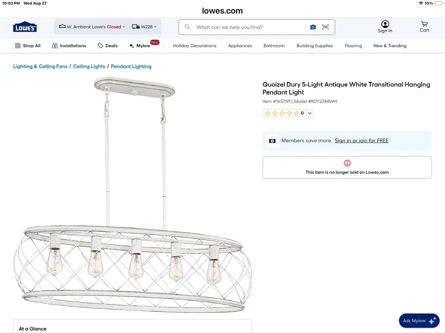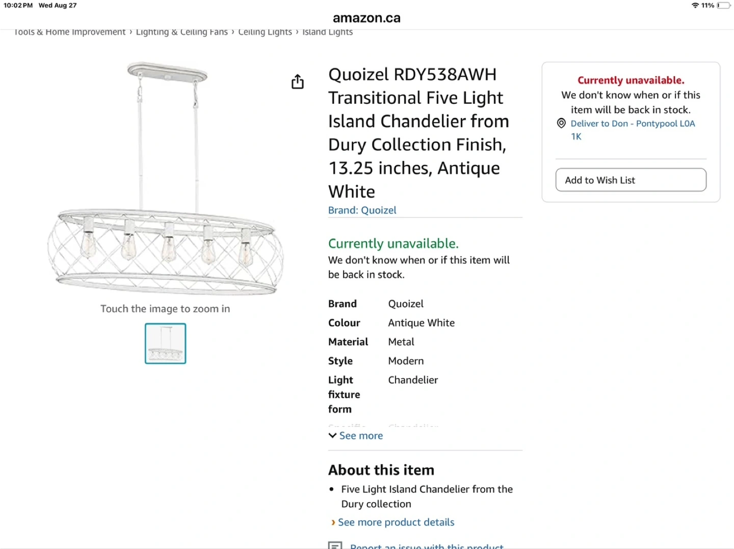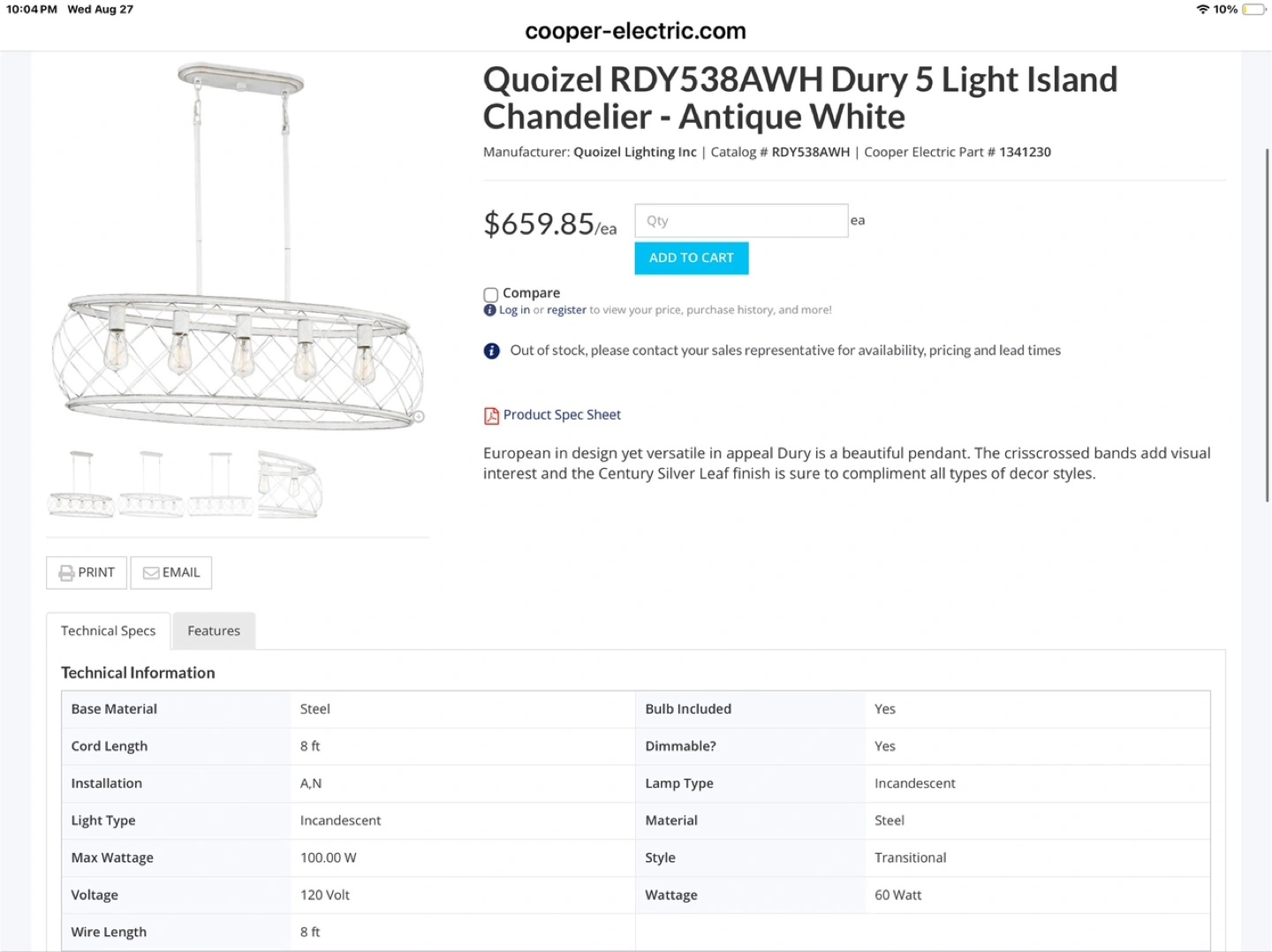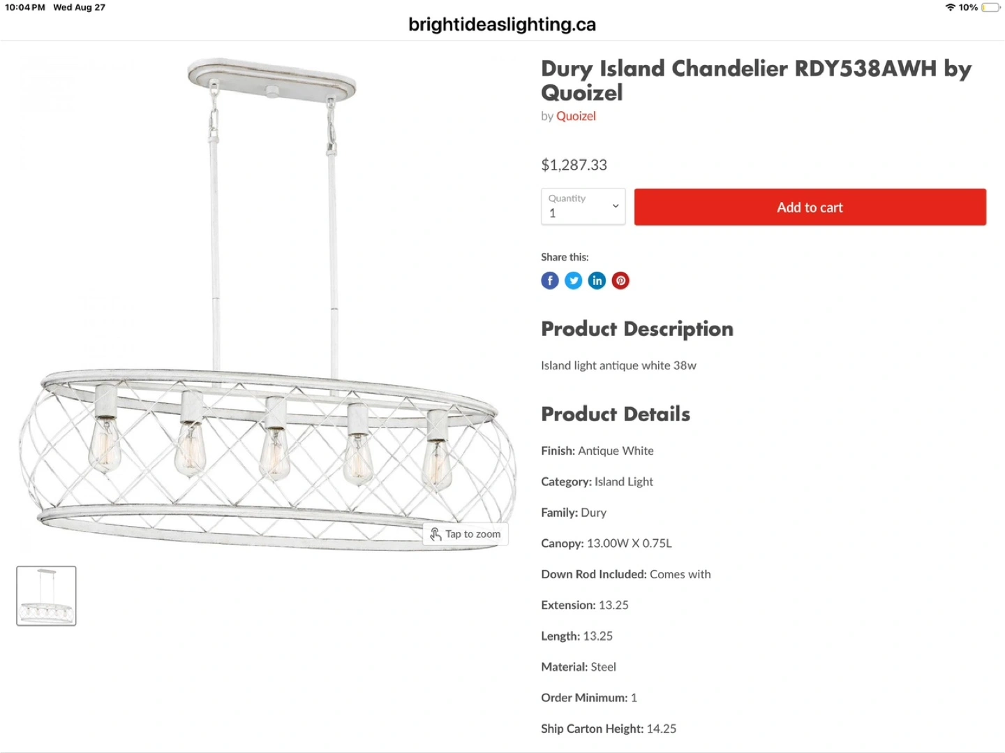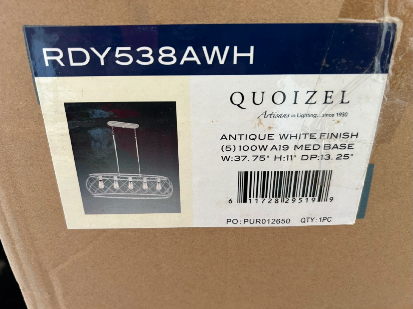Selling a Quoizel RDY538AWH light fixture with an antique white finish. It requires (5) 100W A19 MED base bulbs. The dimensions are: - Width: 37.75 inches - Height: 11 inches - Depth: 13.25 inches