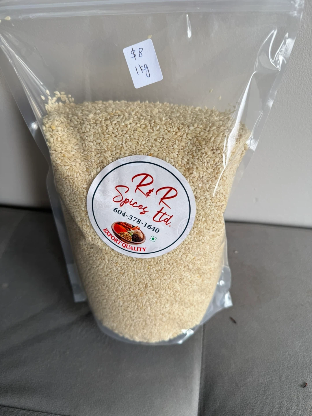 I have a 1 kg bag of sesame seeds from R & R Spices Ltd. for sale. They are export quality and ready to use in your cooking or baking!