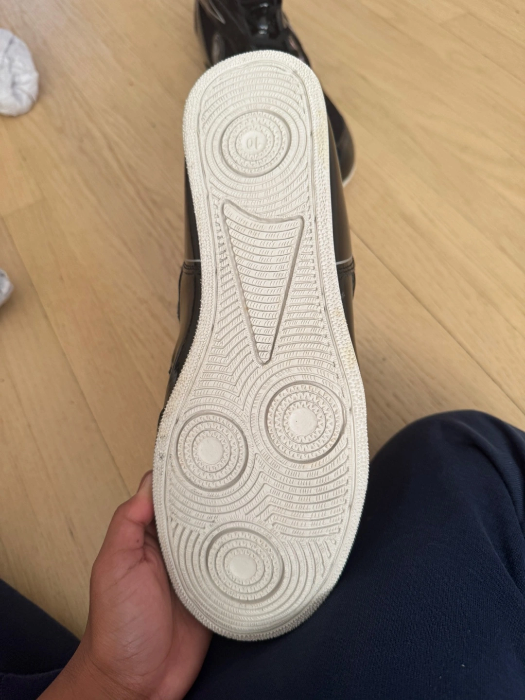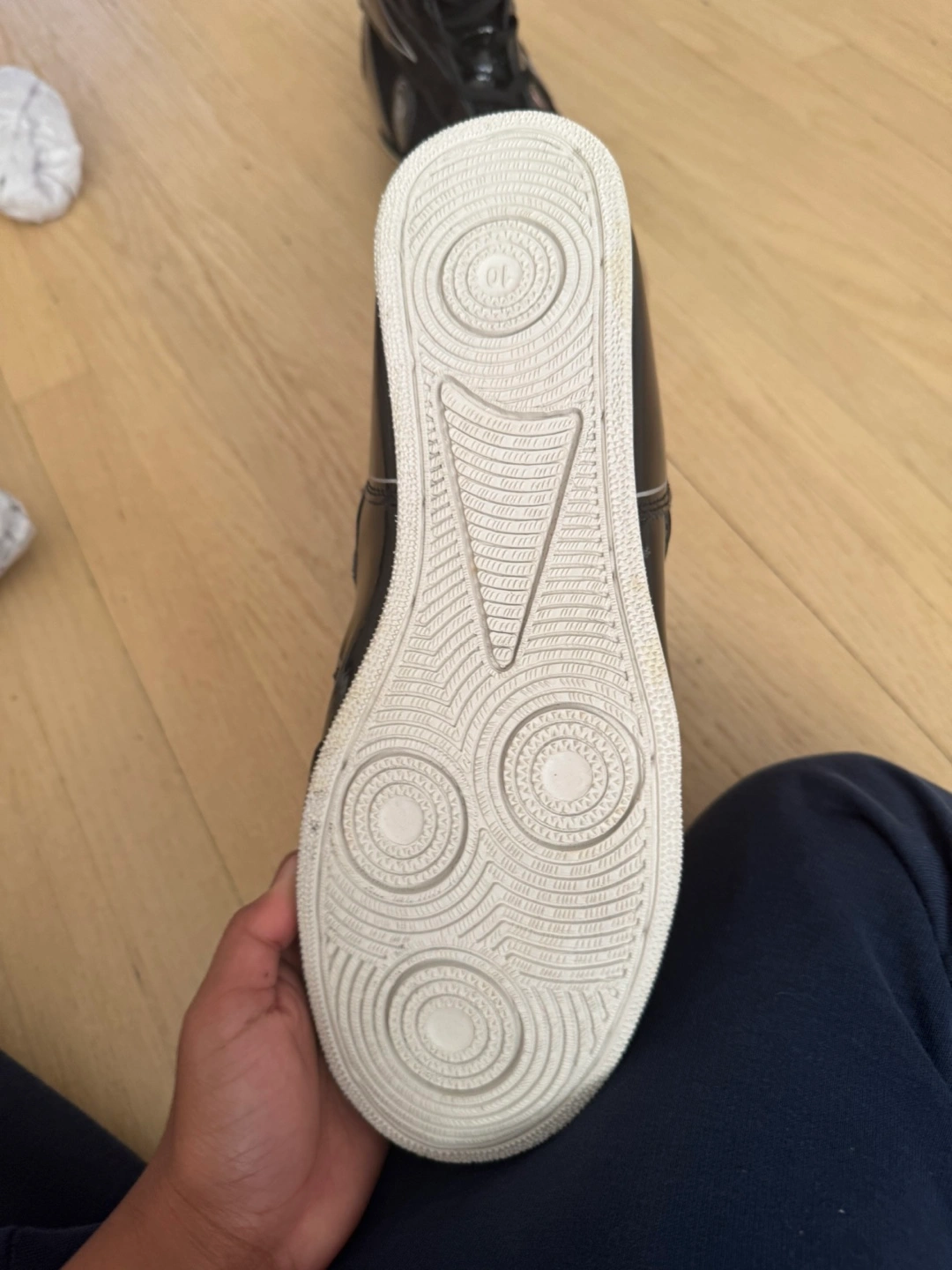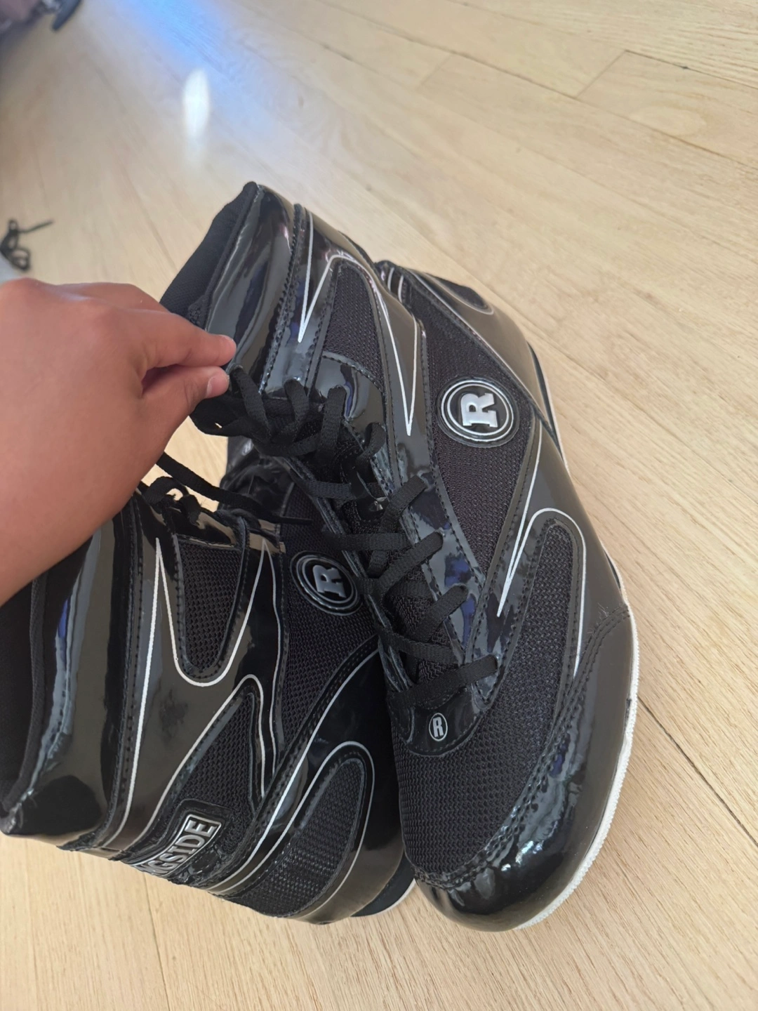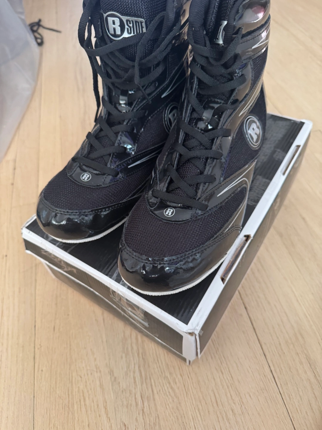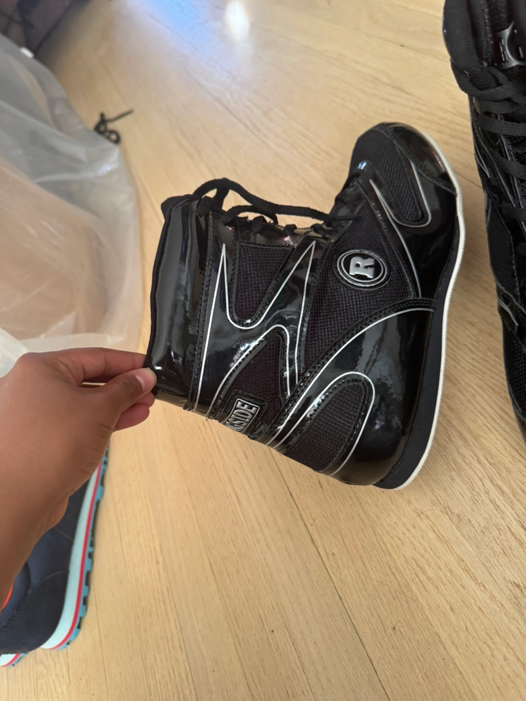 Pair of black R Side boxing boots. Size 10. High-top design. Patent leather and mesh upper. Lace-up closure. White soles. Good for training.