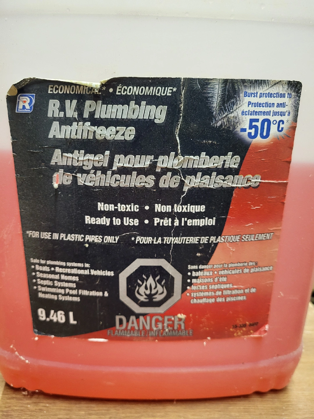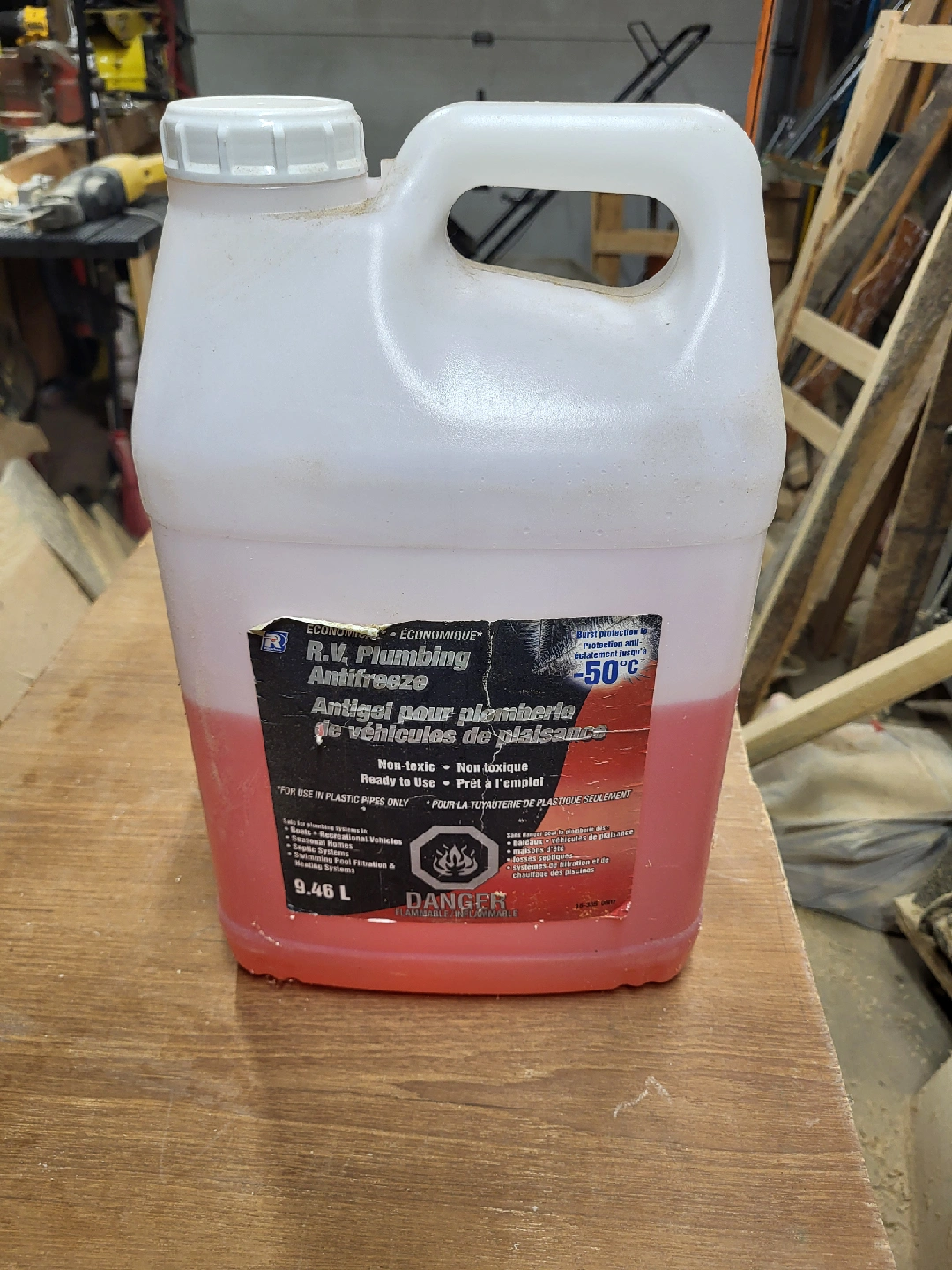 Selling a container of R.V. Plumbing Antifreeze. It's non-toxic and ready to use. Safe for plastic pipes only, suitable for various plumbing systems such as boats, seasonal homes, septic systems, and swimming pool filtration. The container holds 9.46 L.
